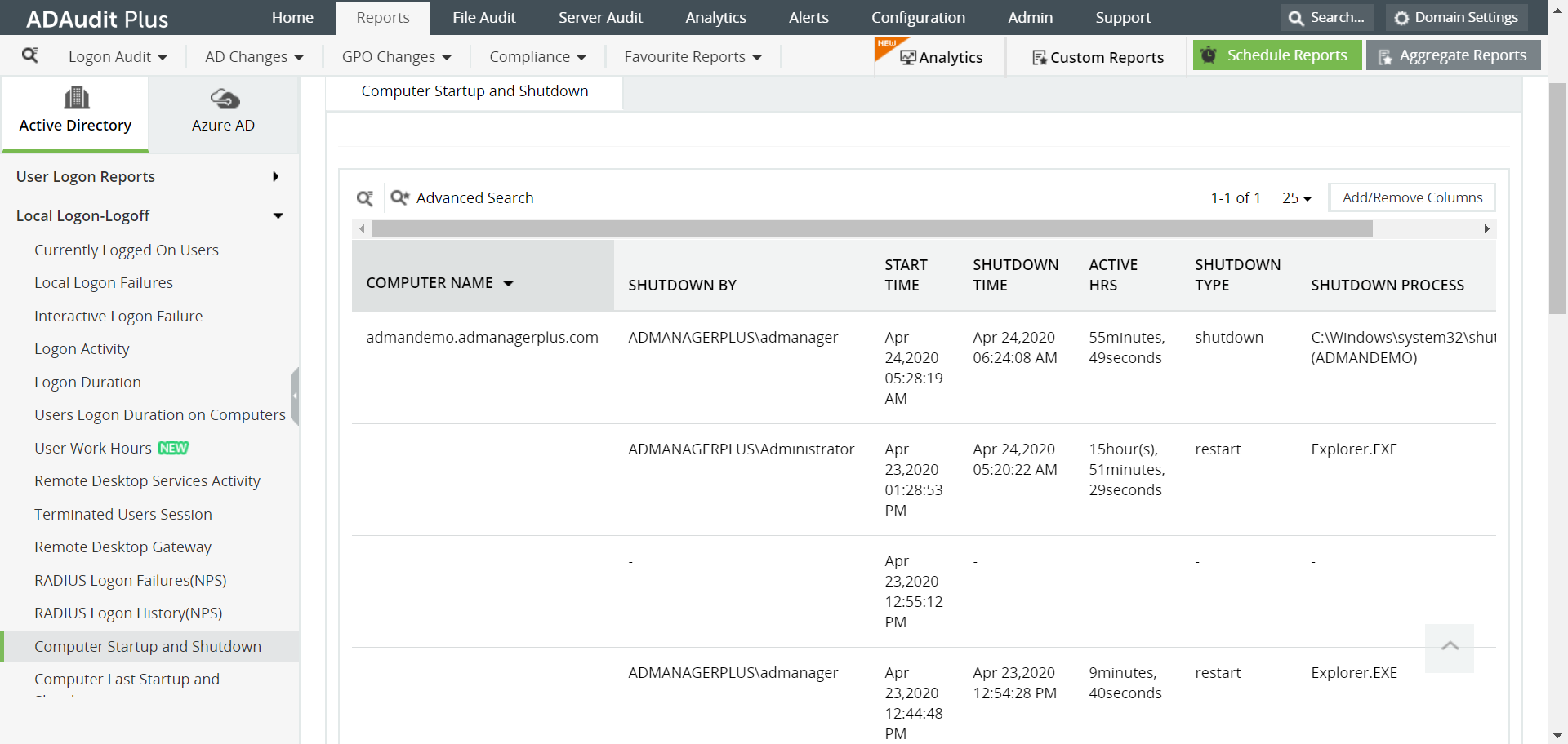 ADAudit Plus genererer rapporten om sidste opstartstidspunkt for fjerncomputere i et enkelt og intuitivt brugerinterface.