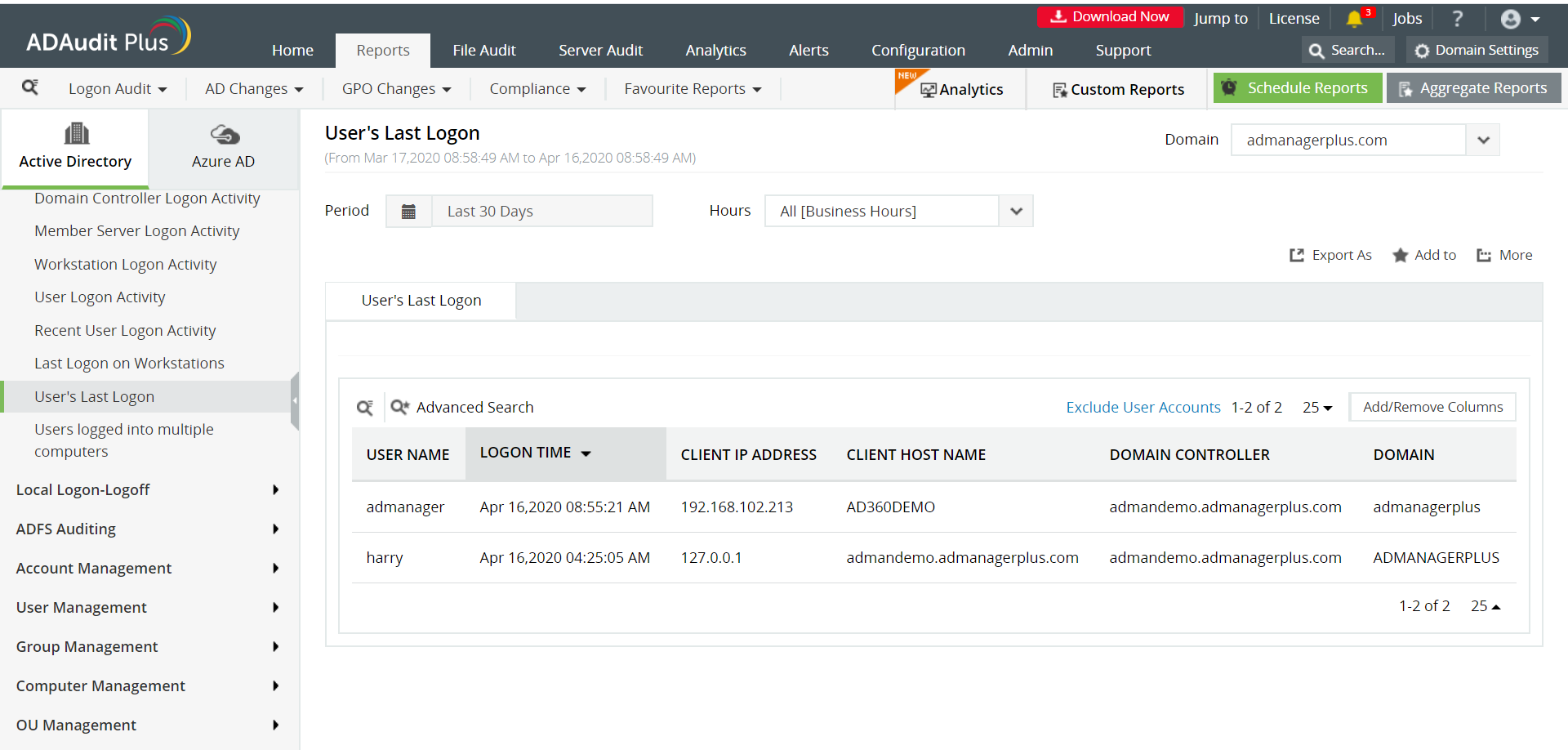 ADAudit Plus genererer derimod, med et klik på en knap, en rapport, der viser en brugers sidste login på en hvilken som helst computer, i et enkelt og intuitivt brugerinterface.
