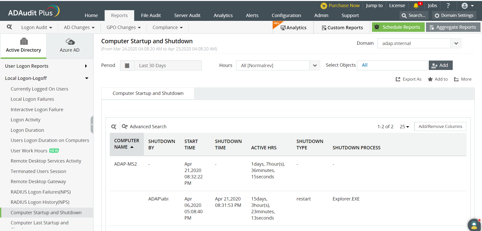 ADAudit Plus scanner automatisk alle domænecontrollere i domænet for at hente oplysninger om nedlukningstidspunktet, genererer rapporten og præsenterer den i et enkelt og intuitivt brugerinterface.