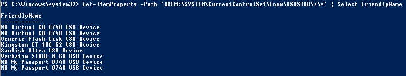 Get-ItemProperty -Path 'HKLM:\SYSTEM\CurrentControlSet\Enum\USBSTOR\*\*' | Select FriendlyName