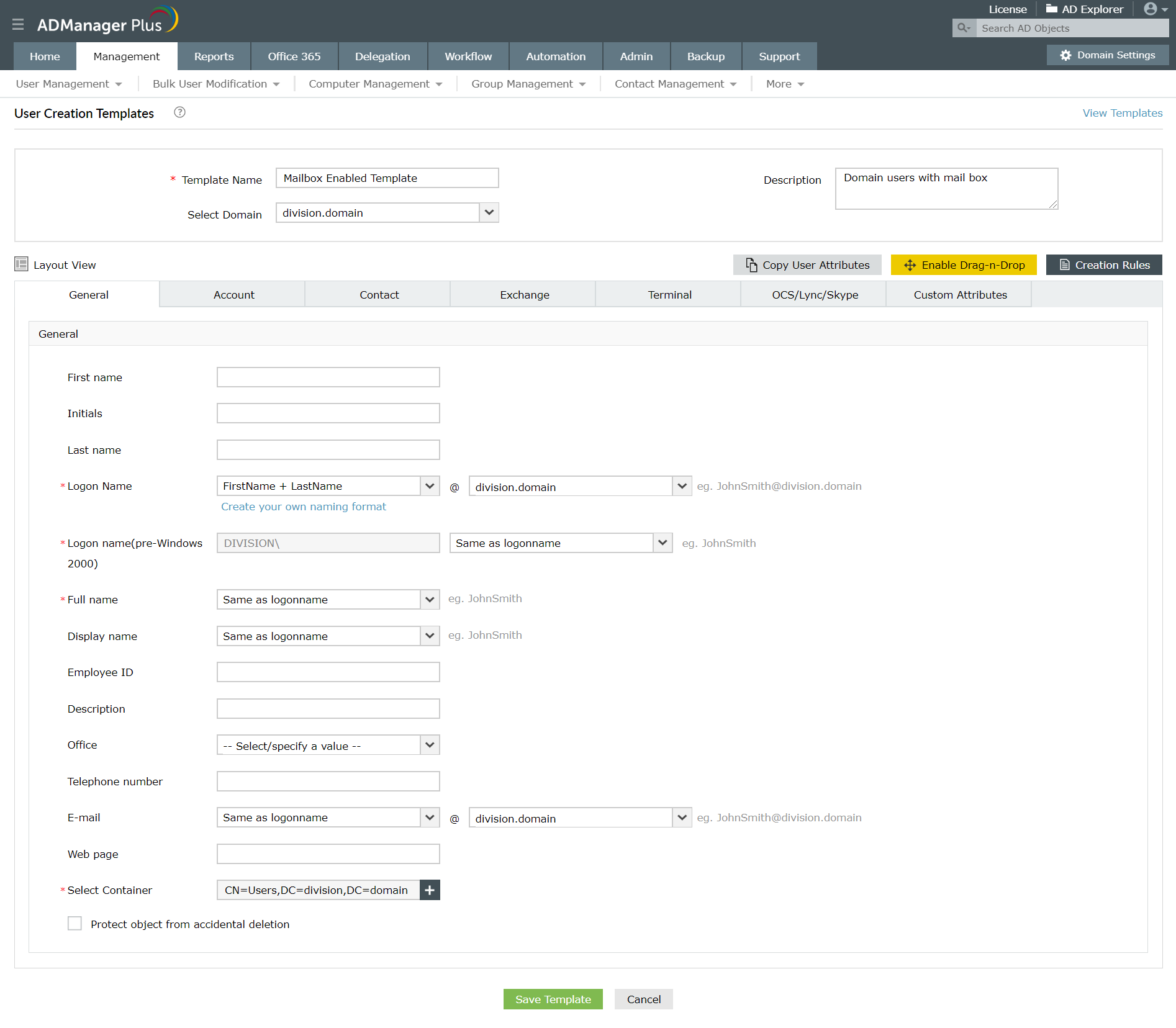 ADManager Plus' komplette funktion til oprettelse af Active Directory-brugerkonti giver dig mulighed til at oprette nye brugerkonti både enkeltvis og som massehandling. Denne webbaserede software til administration af Active Directory forenkler oprettelse af brugerkonti med sine skabeloner til brugerklargøring, der giver dig mulighed for at oprette en ny brugerkonto med alle de krævede attributter, inklusive Exchange Server-postkasse- og LCS-/OCS-attributter i kun ét trin. Det ville kræve en enorm indsats at gøre dette med kun de indbyggede AD-værktøjer eller PowerShell.
