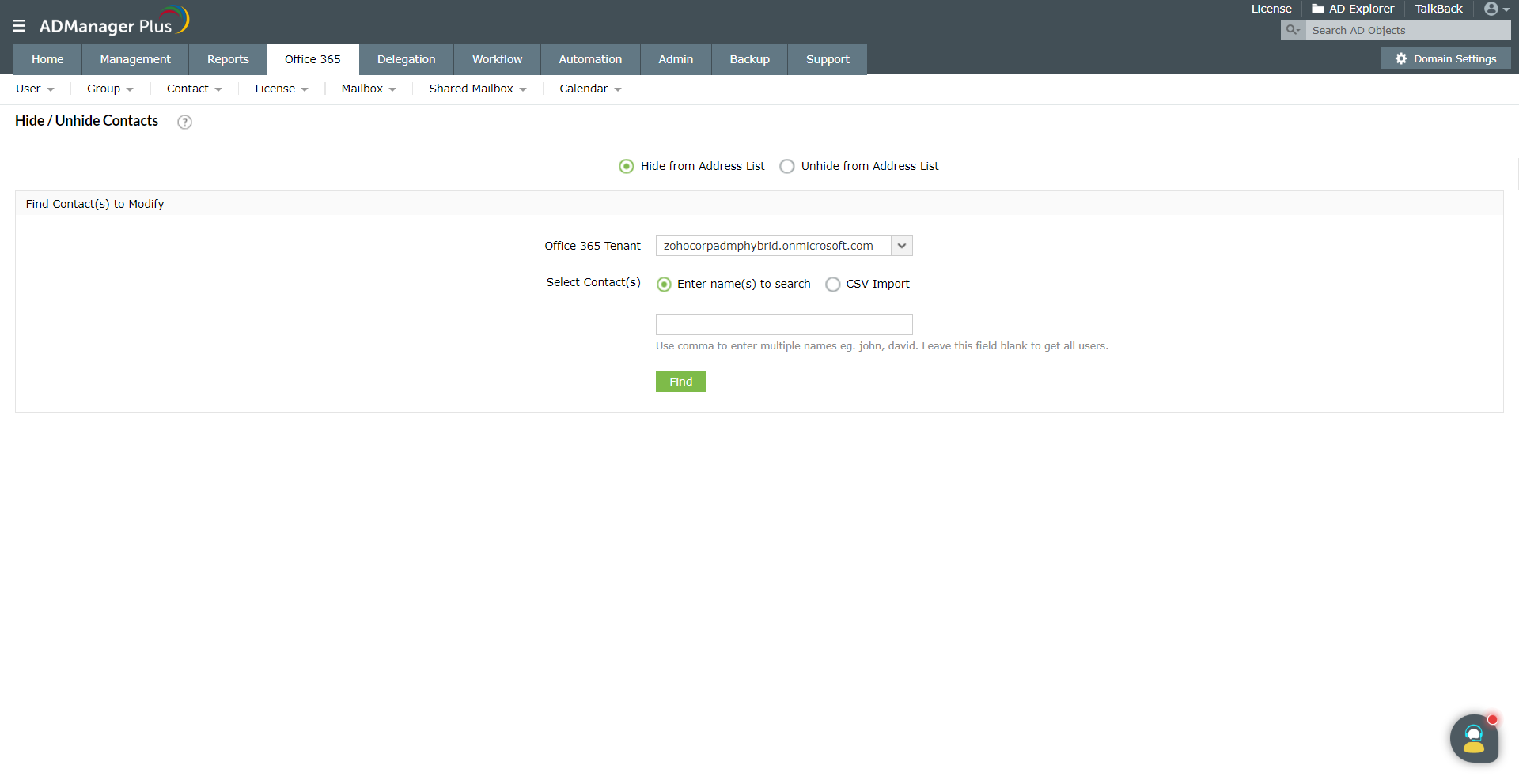Klik her, for at se hvordan du skjuler eller synliggør Microsoft 365-kontakter i globale adresselister med ADManager Plus: