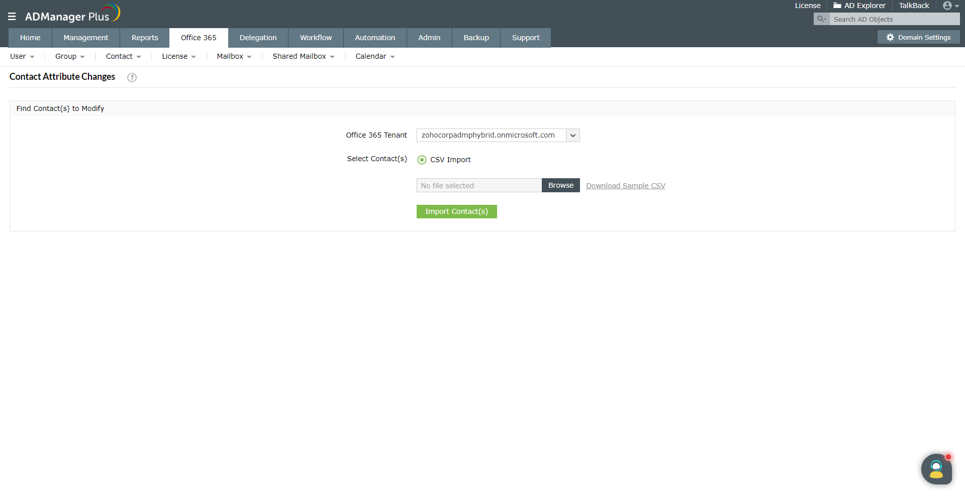 ADManager Plus tilbyder en enkelt konsol til at masseadministrere kontakter i Active Directory (AD) og Microsoft 365 med blot et par klik.