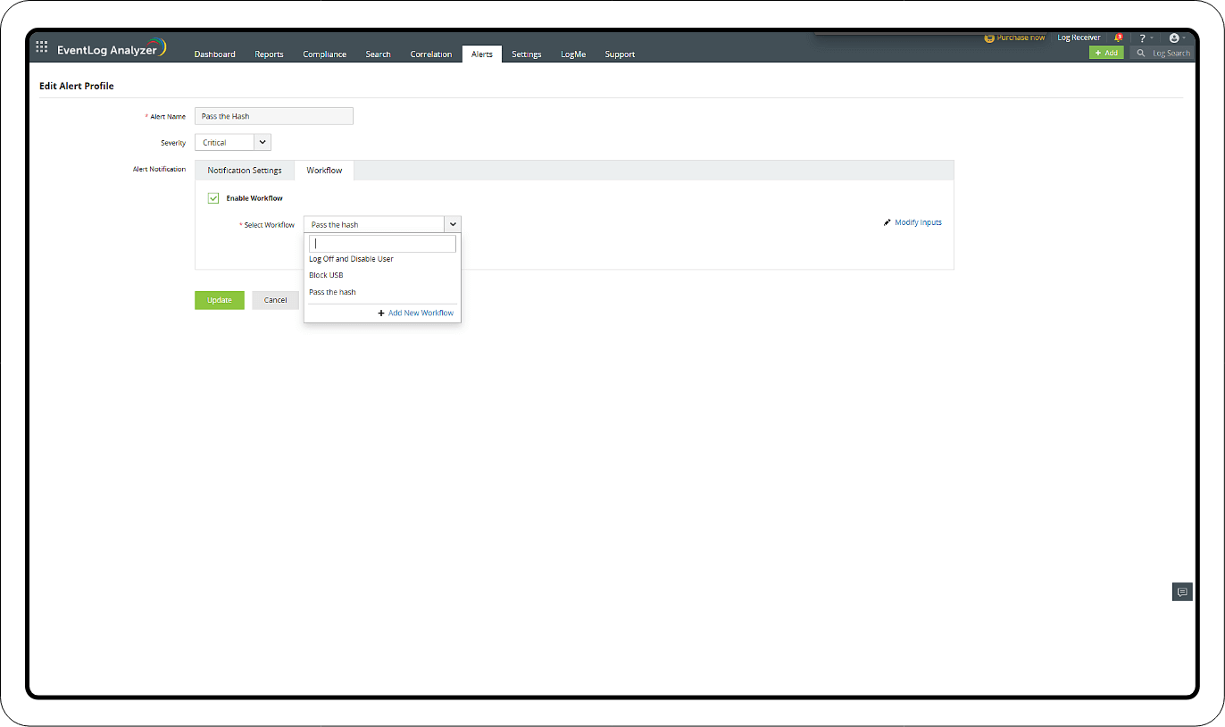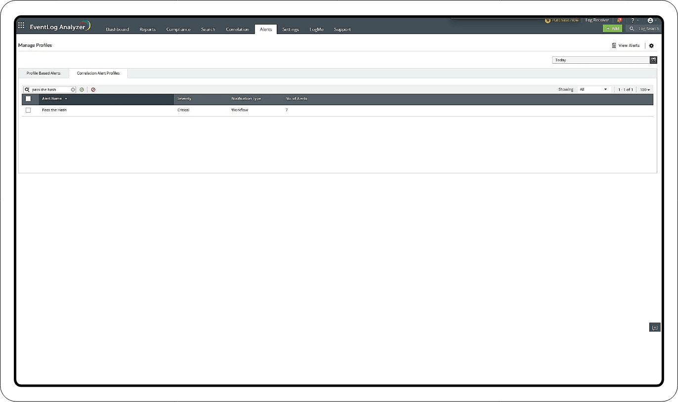 - Gå til Log360-konsollen > SIEM > Advarsler > klik på indstillingsikonet øverst til højre > Administrer profiler > Korrelationsadvarselsprofiler > klik på søgeikonet, vælg den pass-the-hash-regel, der blev oprettet > klik på Konfigurer.