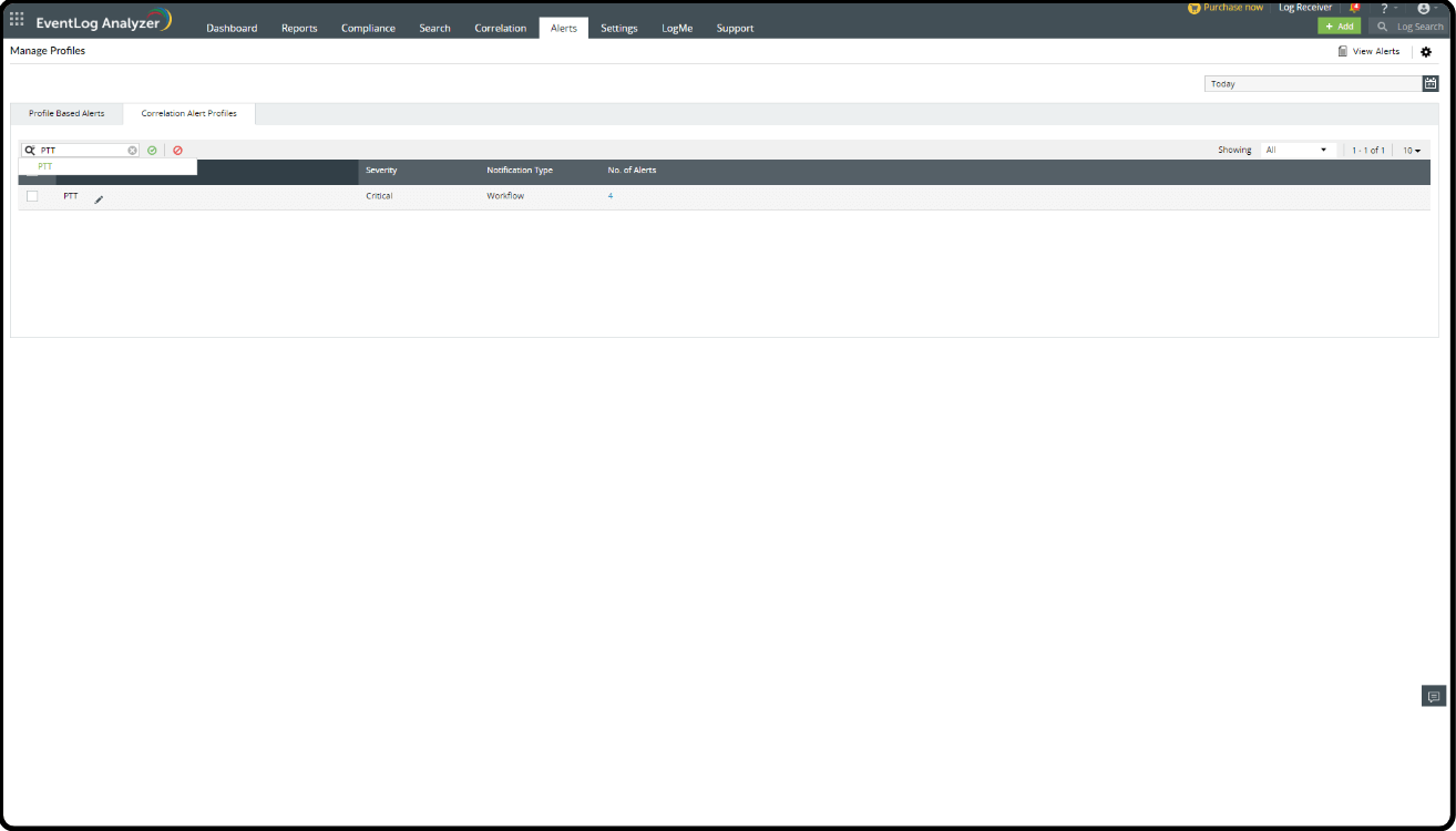 - Under Administrer profiler, vælg Korrelationsalarmprofiler. Klik så på søgeikonet, og vælg PTT (navnet på korrelationsregle).