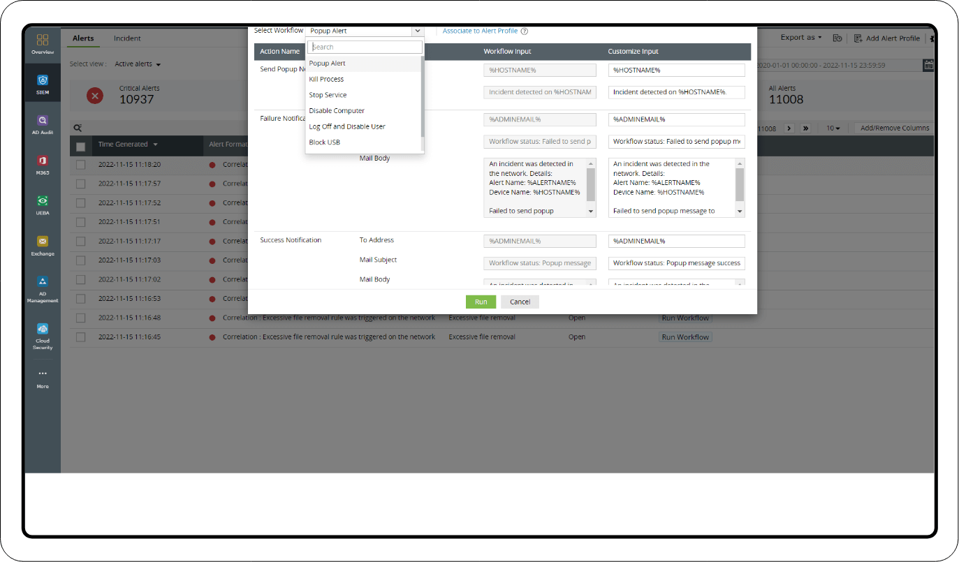 Afhjælpning: Tilføj de udløste advarsler som hændelser, og brug Log360's hændelsesdashboard til straks at køre arbejdsgange med reaktioner. Arbejdsgangen har handlinger som at afslutte processen, udlogge og deaktivere brugeren og deaktivere computeren for at stoppe angrebet.