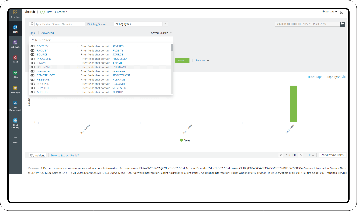 Når du begynder at observere advarsler om ovennævnte hændelser, kan du undersøge det nærmere ved at søge i loggen. Brug hændelses-ID 4624 og 4672 til at analysere loginaktiviteterne. Log360 hjælper dig med at få øje på usædvanlige logdata og tomme felter. Gå gennem hændelseshistorikken, og tilføj yderligere kriterier som brugernavn og SID til at filtrere logdataene.