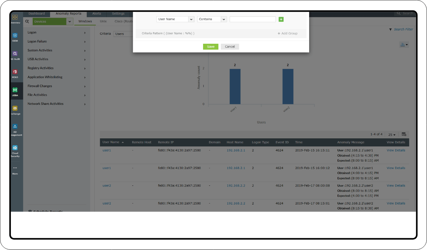 Overvågning af privilegerede brugere: Undersøg mistænkelige loginaktiviteter baseret på tidspunkts-, antals- og mønsterafvigelser ved hjælp af rapporterne Login og Mislykket login. Du kan også tilføje filtre for at undersøge aktiviteterne for bestemte brugerkonti og privilegerede brugere.