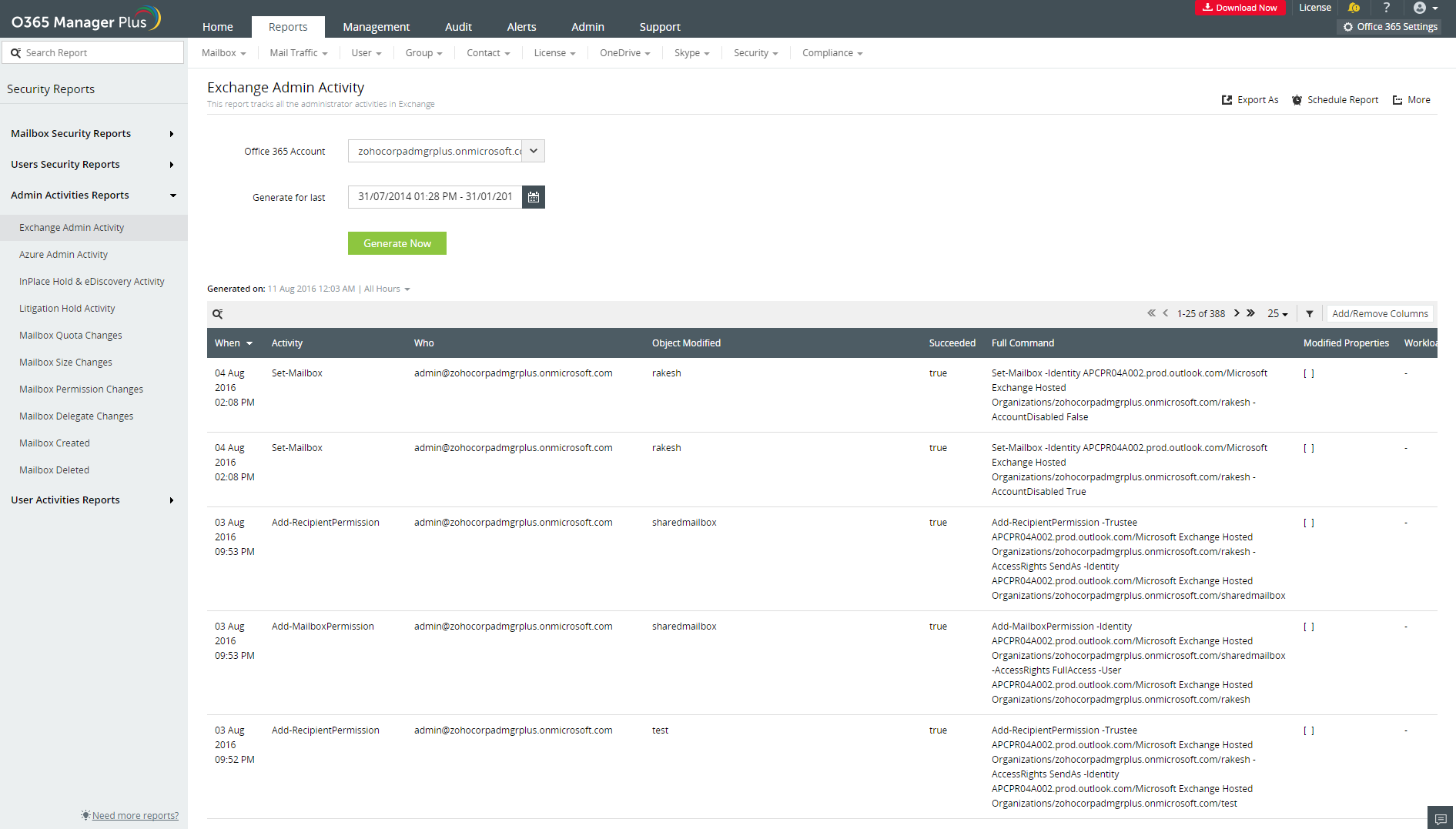 Styrk din organisations sikkerhed ved at overvåge alle administratoraktiviteter i dit Microsoft 365-miljø med M365 Manager Plus’ aktivitetsrapporter. Disse rapporter indeholder også detaljerede oplysninger om alle ændringer, som Exchange-administratorer gør til retsligt tilbageholdte objekter.