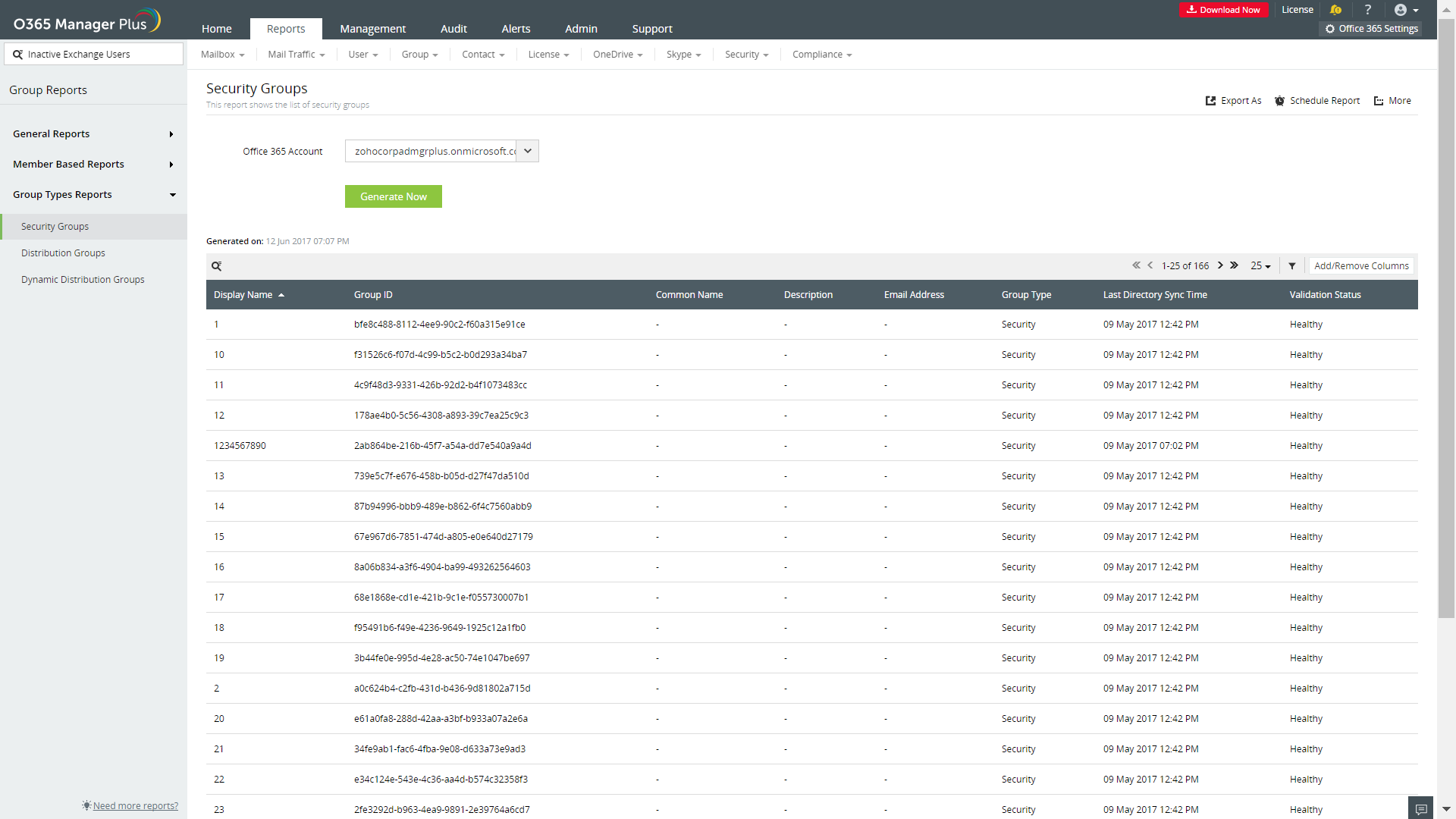 M365 Manager Plus’ grupperapporter giver dig værdifuld indsigt i forskellige aspekter af dine Microsoft 365-grupper uden kompliceret PowerShell-scripting. For at få adgang til alle dine Microsoft 365-gruppedata, skal du blot udføre et par klik fra vores webkonsol. Disse rapporter viser også informationsfelter relateret til gruppen, som f.eks. visningsnavn, beskrivelse, e-mail-adresse og sidste DirSync-tid. Du kan også planlægge, hvornår rapporterne skal genereres, og eksportere dem til PDF-, XLS-, HTML- og CSV-filformater.