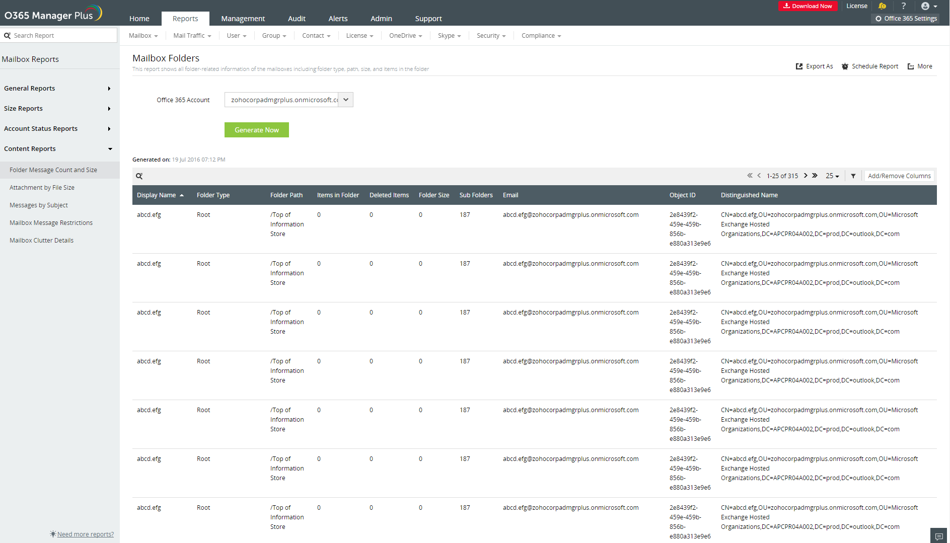 M365 Manager Plus indeholder detaljerede rapporter om indholdet af alle postkasser i din organisation. Rapporter om postkasseindhold hjælper dig med at filtrere postkasser ved hjælp af forskellige parametre, såsom størrelsen af mapper, besked-tæller, mail-emne og størrelse af vedhæftede filer.