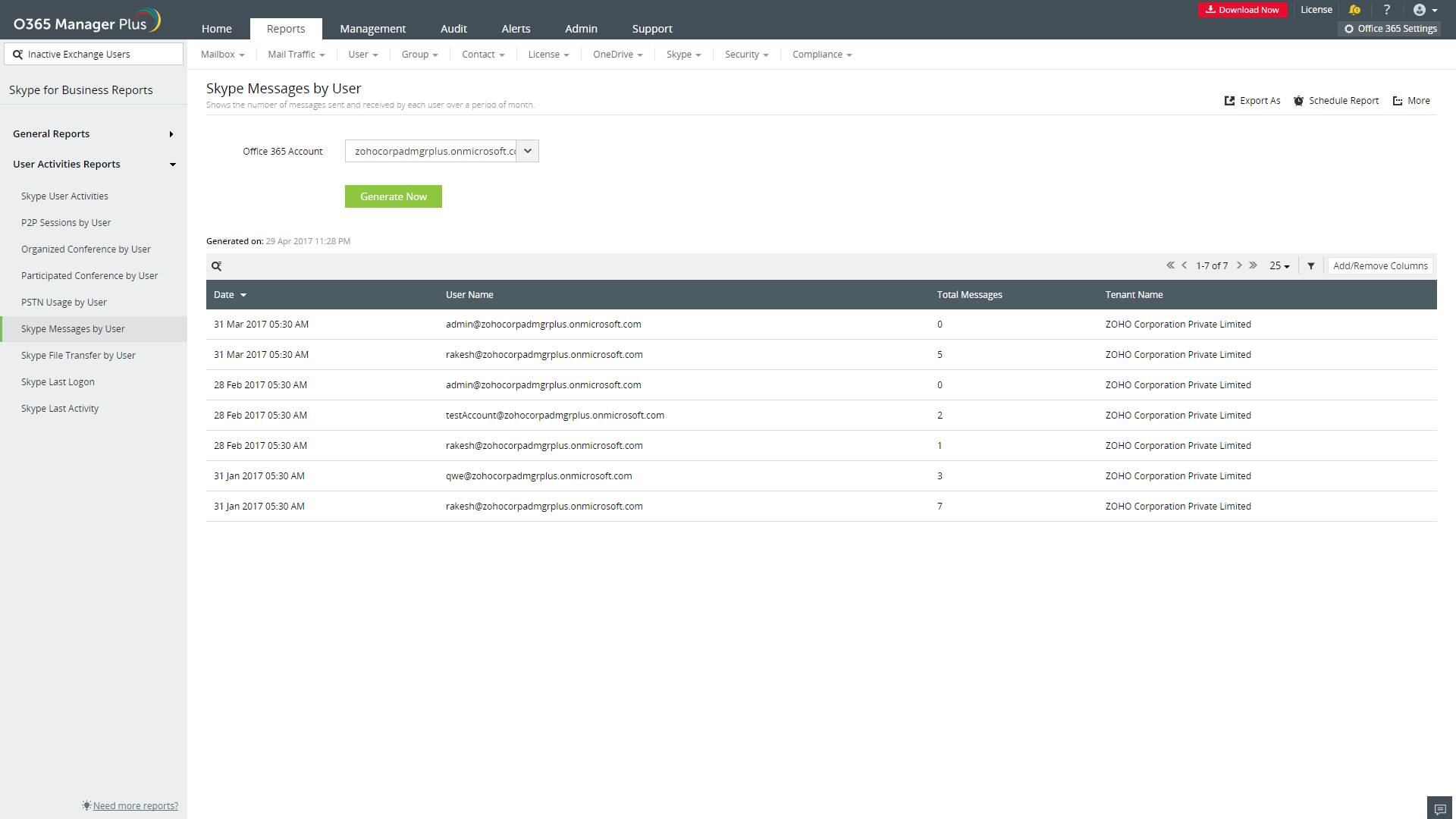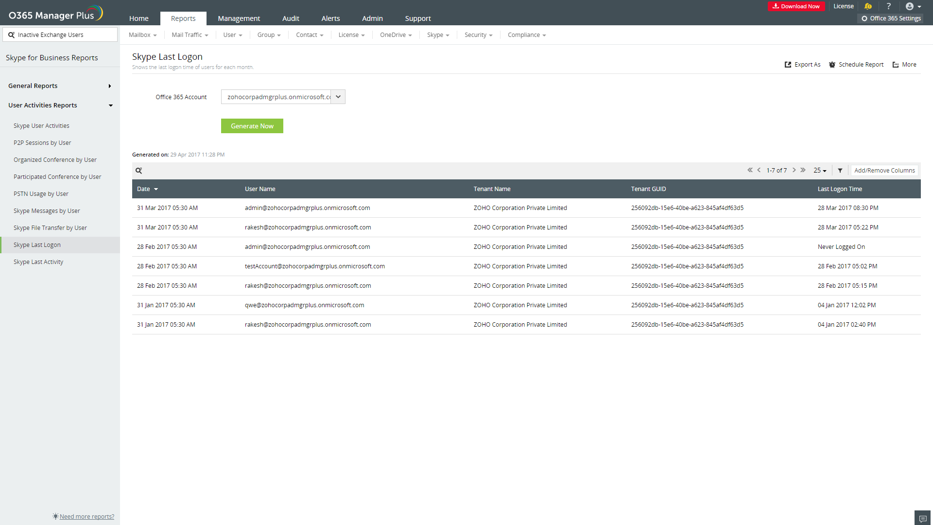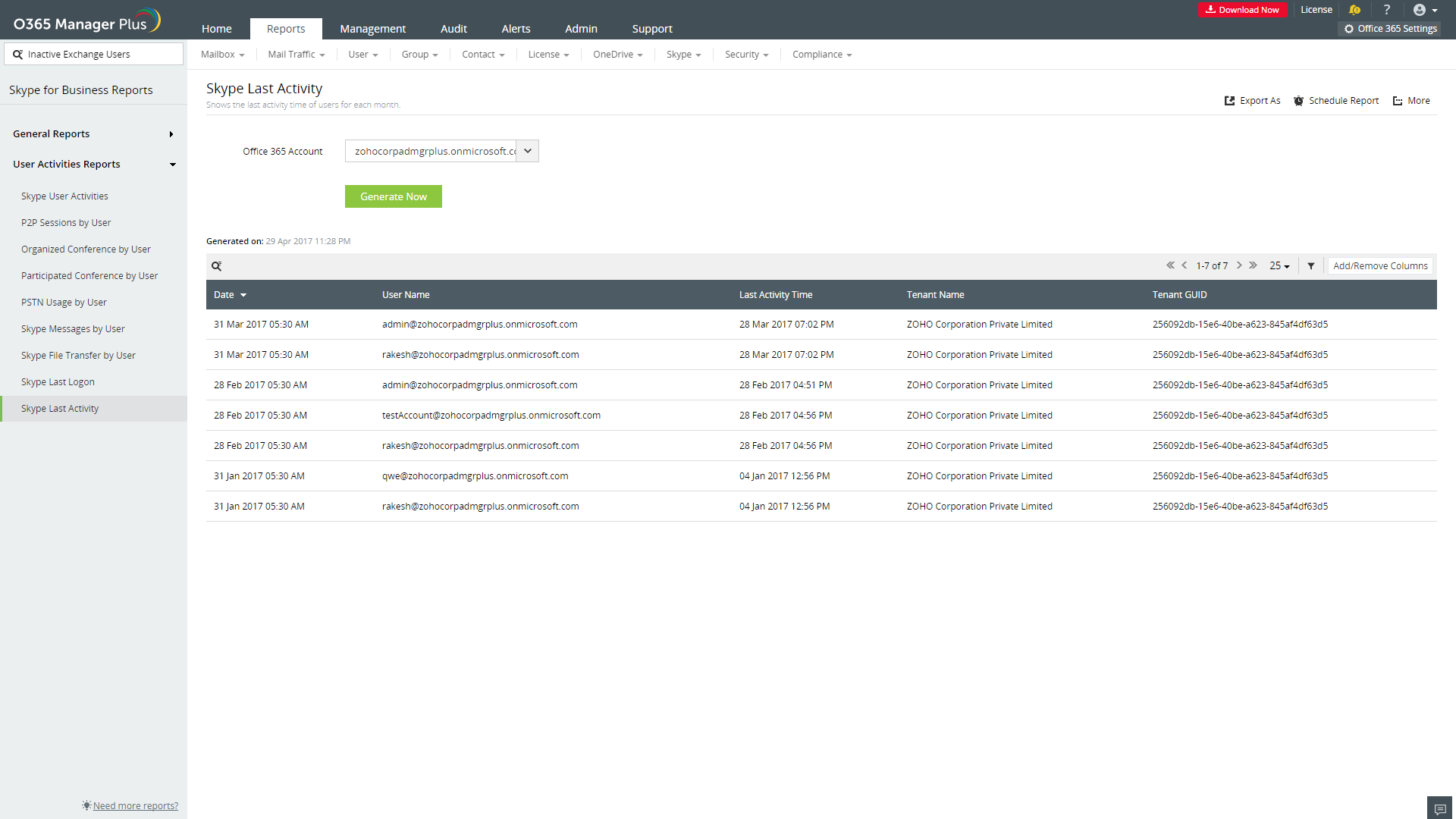 M365 Manager Plus, der er et omfattende Microsoft 365 rapporteringsværktøj, leverer Skype for Business aktivitetsrapporter, som indeholder oplysninger om sidste logon tid, seneste aktivitetstid og brugsstatistikker over brugere over en given måned. Ved hjælp af denne rapport og dens underrapporter kan du holde øje med brugeraktiviteter og forstå brugen af Skype for Business i din Microsoft 365 opsætning.