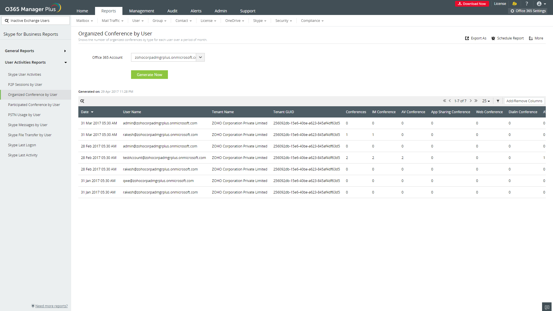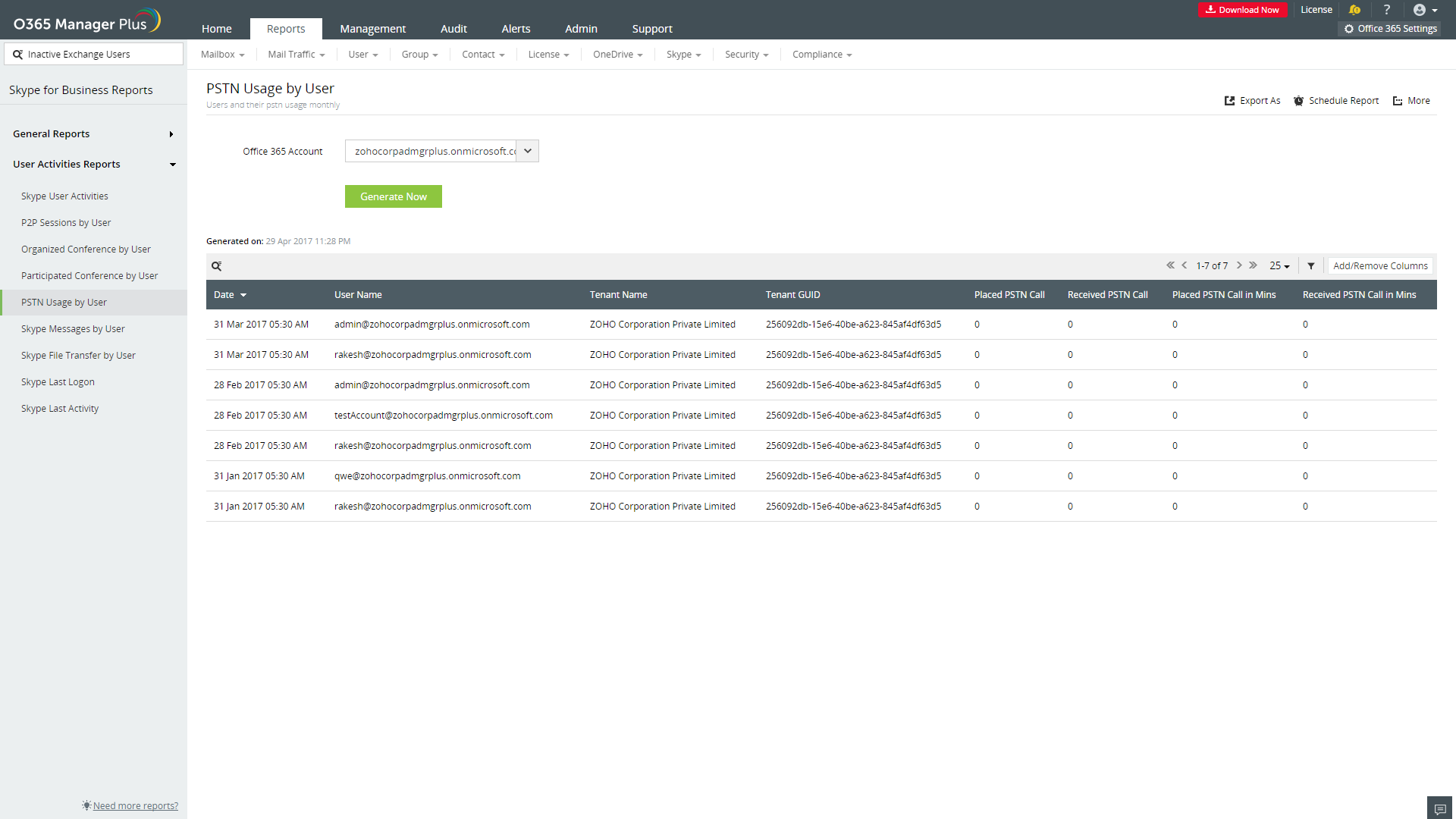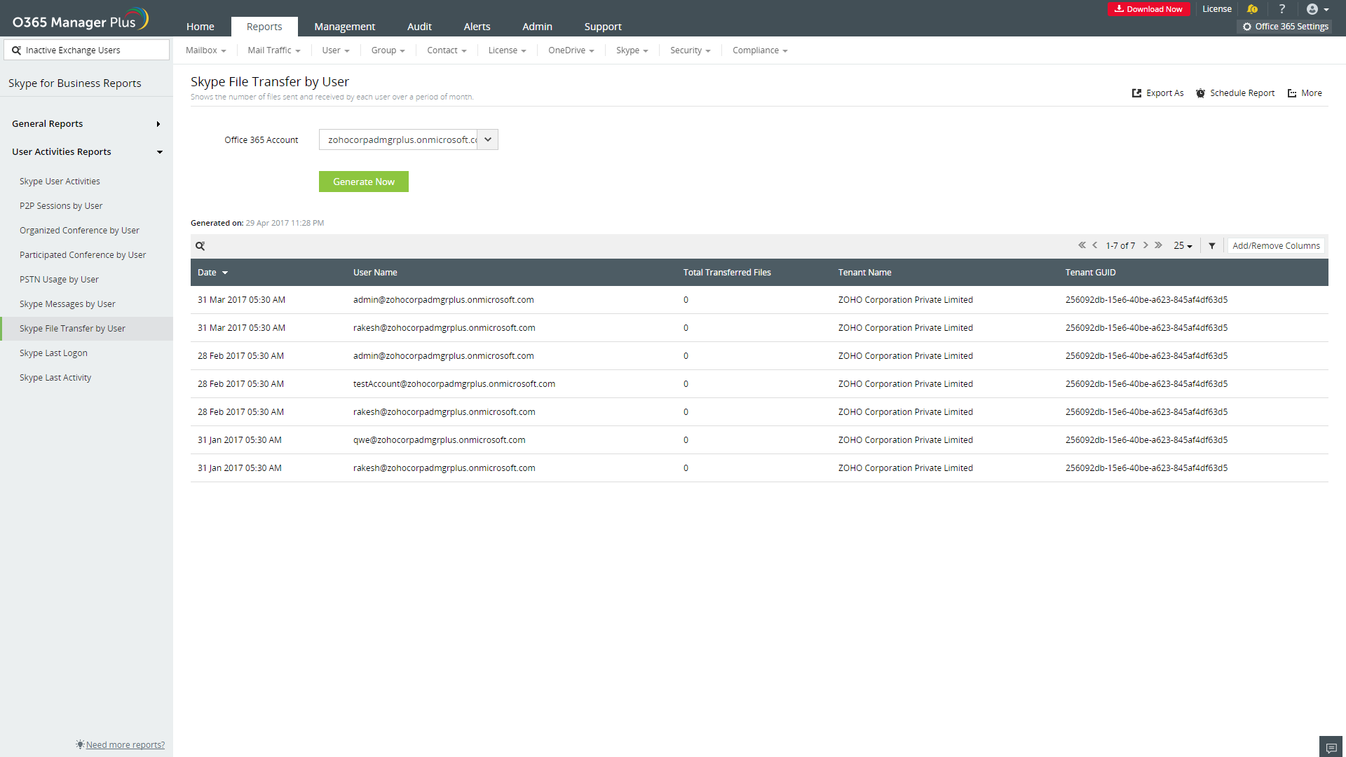 M365 Manager Plus, der er et omfattende Microsoft 365 rapporteringsværktøj, leverer Skype for Business aktivitetsrapporter, som indeholder oplysninger om sidste logon tid, seneste aktivitetstid og brugsstatistikker over brugere over en given måned. Ved hjælp af denne rapport og dens underrapporter kan du holde øje med brugeraktiviteter og forstå brugen af Skype for Business i din Microsoft 365 opsætning.
