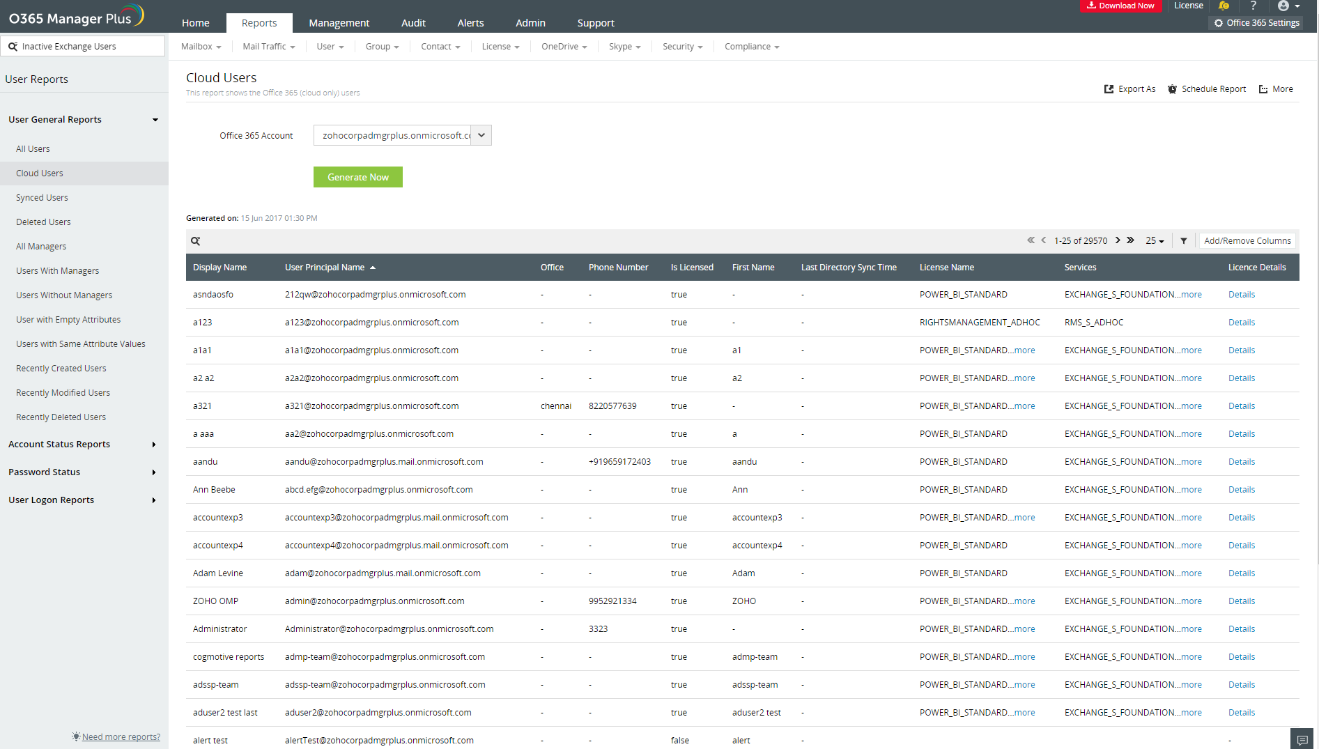 M365 Manager Plus hjælper dig med at spore alle brugerkonti i dit Microsoft 365-miljø med deres omfattende sæt af forudindstillede brugerrapporter. Disse rapporter er et bedre alternativ til besværlige PowerShell-scripts og giver dig alle de vigtige oplysninger, du har brug for om dine Microsoft 365-brugere med blot et par klik. Dette web-baserede værktøj giver dig mulighed for at eksportere dine rapporter til PDF-, XLS-, HTML- og CSV-filformater. Du kan også planlægge den tid, hvor du ønsker at rapporterne skal genereres.