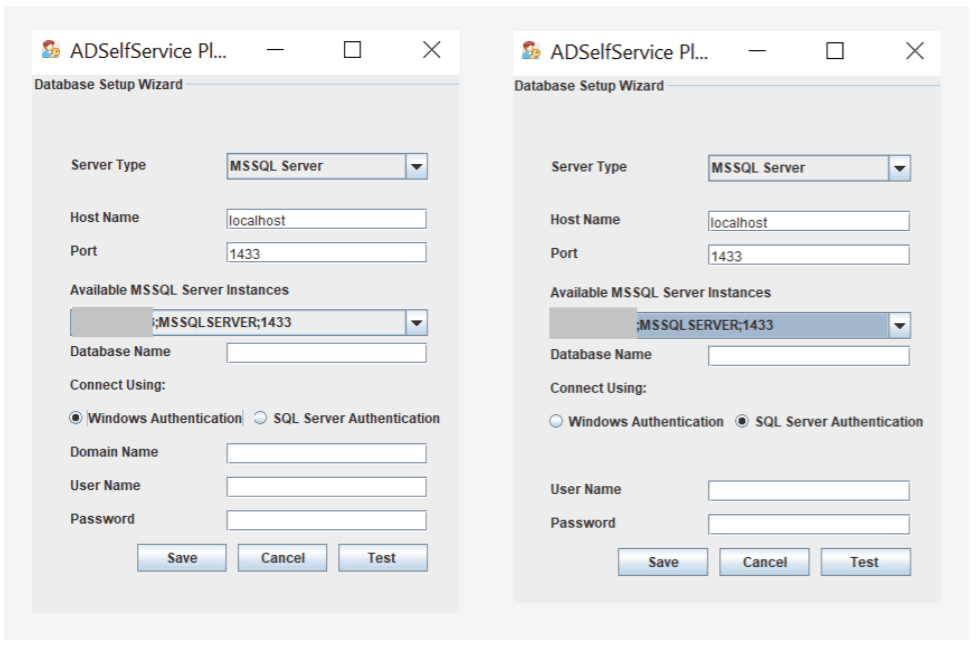 - Windows-godkendelse kan ikke anvendes, når ADSelfService Plus-serveren og MS SQL-serveren er placeret i forskellige domæner. I så fald skal du bruge SQL Server-godkendelse.