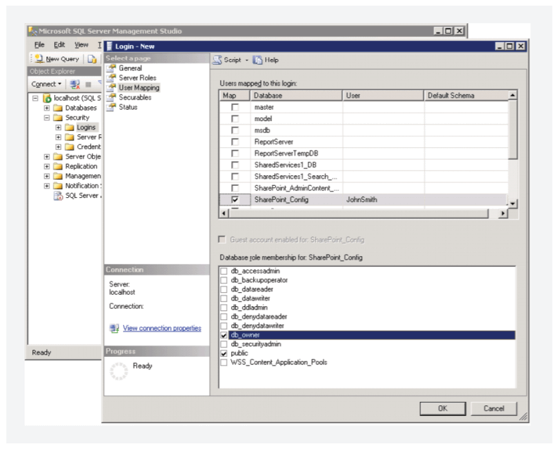 - Gå til Brugertilknytning i venstre panel. Marker afkrydsningsfeltet ud for databasen på listen Brugere, der er knyttet til dette login. Vælg db_owner på listen Databaserollemedlemskab, og klik på OK.