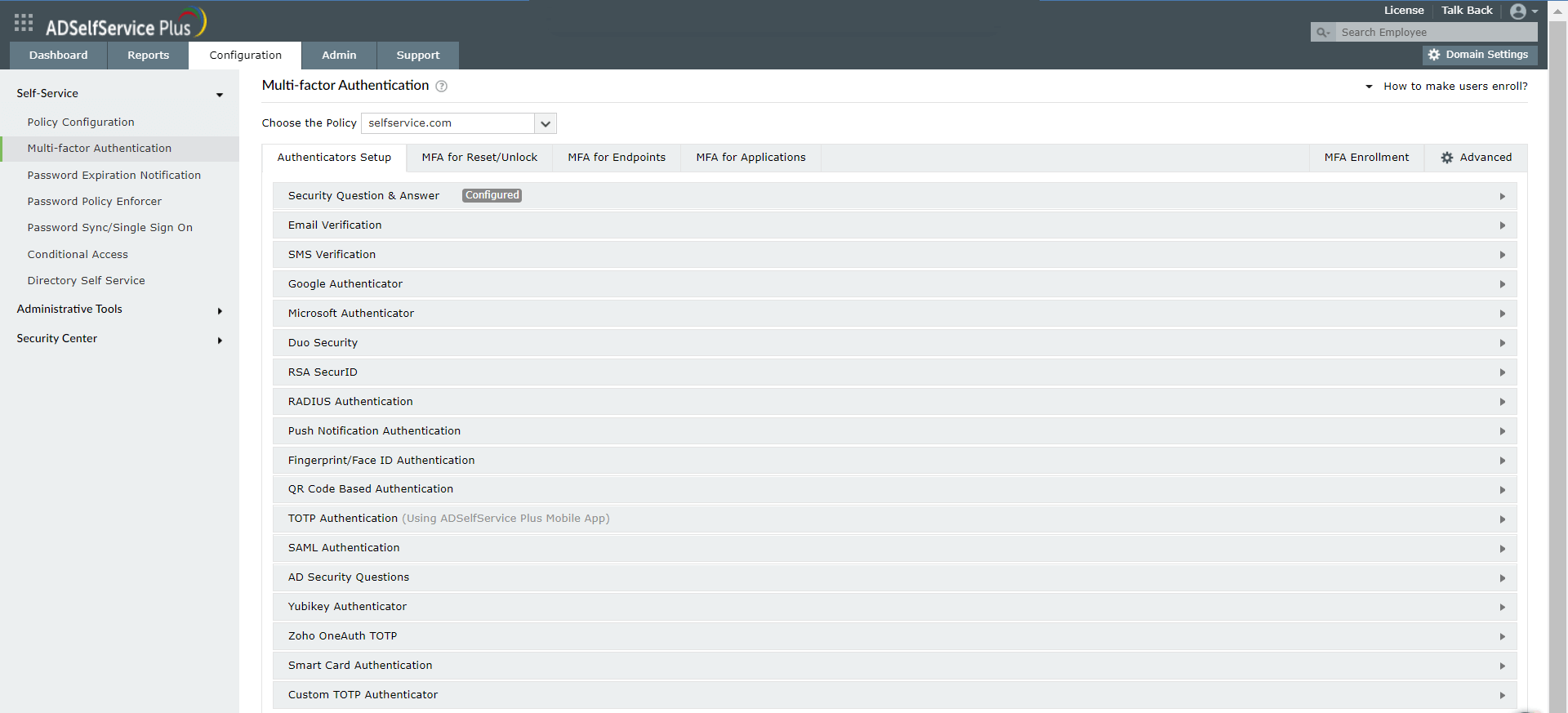 Aktivér MFA for privilegerede brugerkonti ved hjælp af ADSelfService Plus