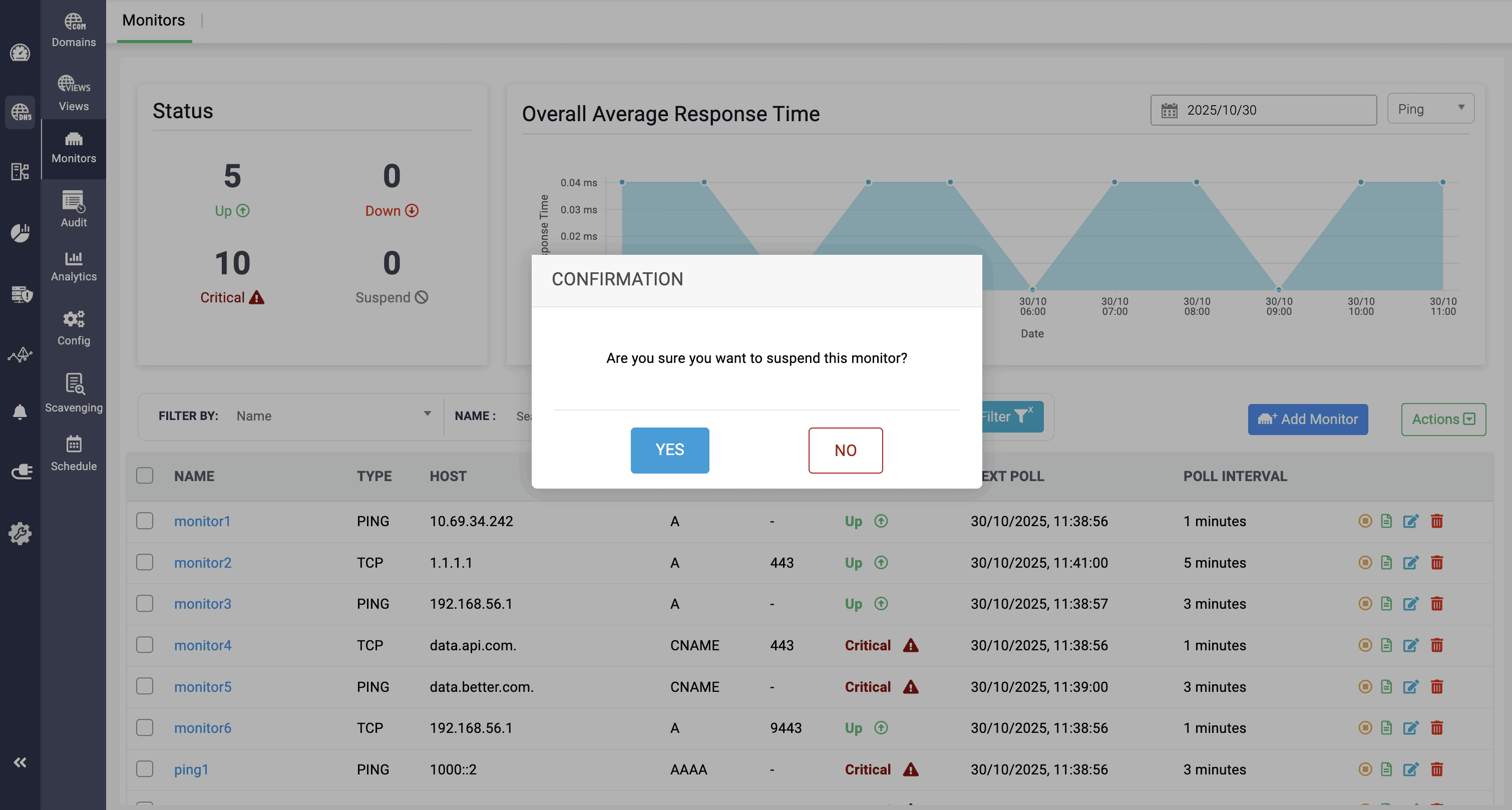 DDI Central’s monitor dashboard provides clear visibility into the current status of DNS records (up, down, critical, suspended), overall average response time, and a tabular view of monitor details such as name, type, host, associated record, port, next poll, and poll interval.