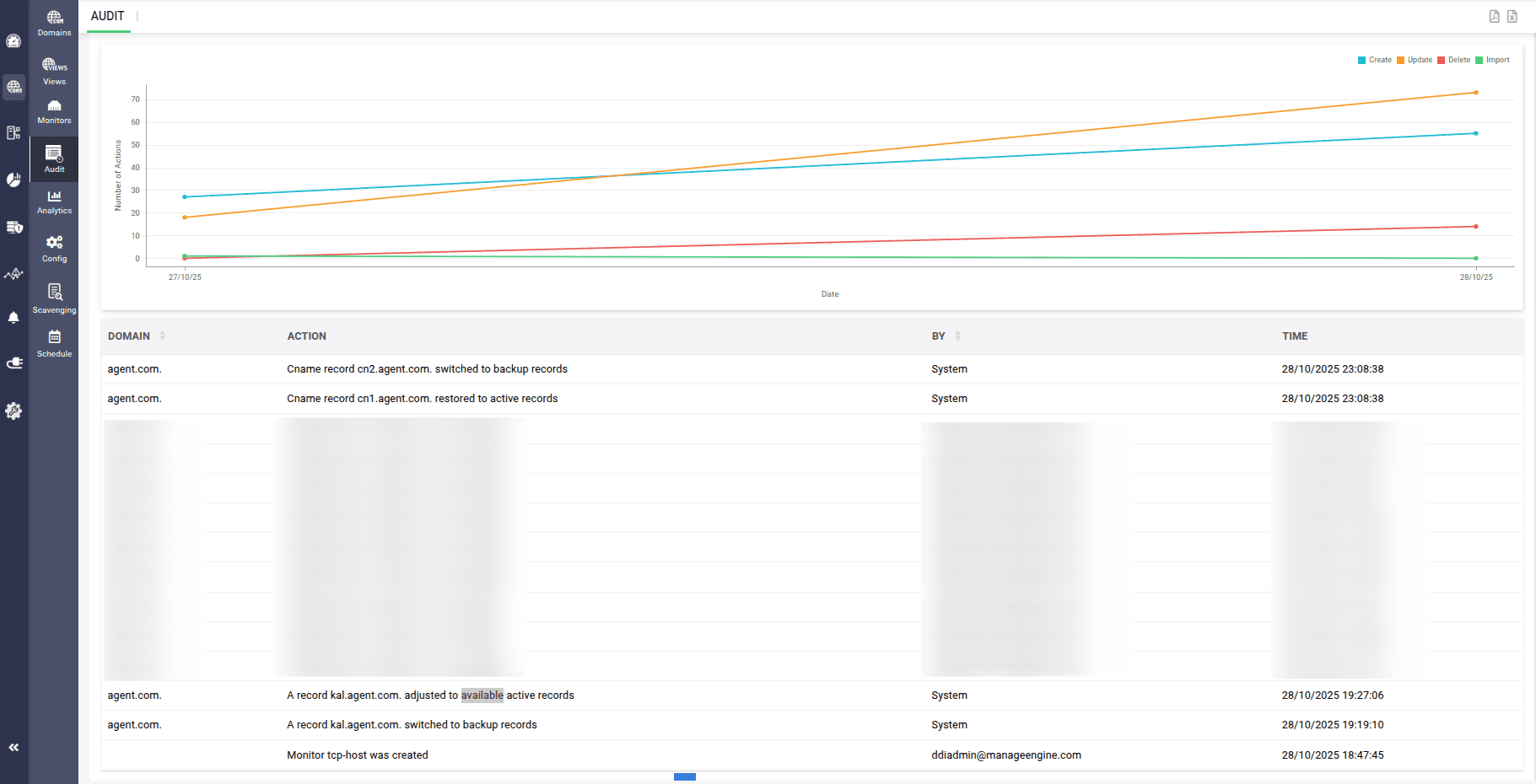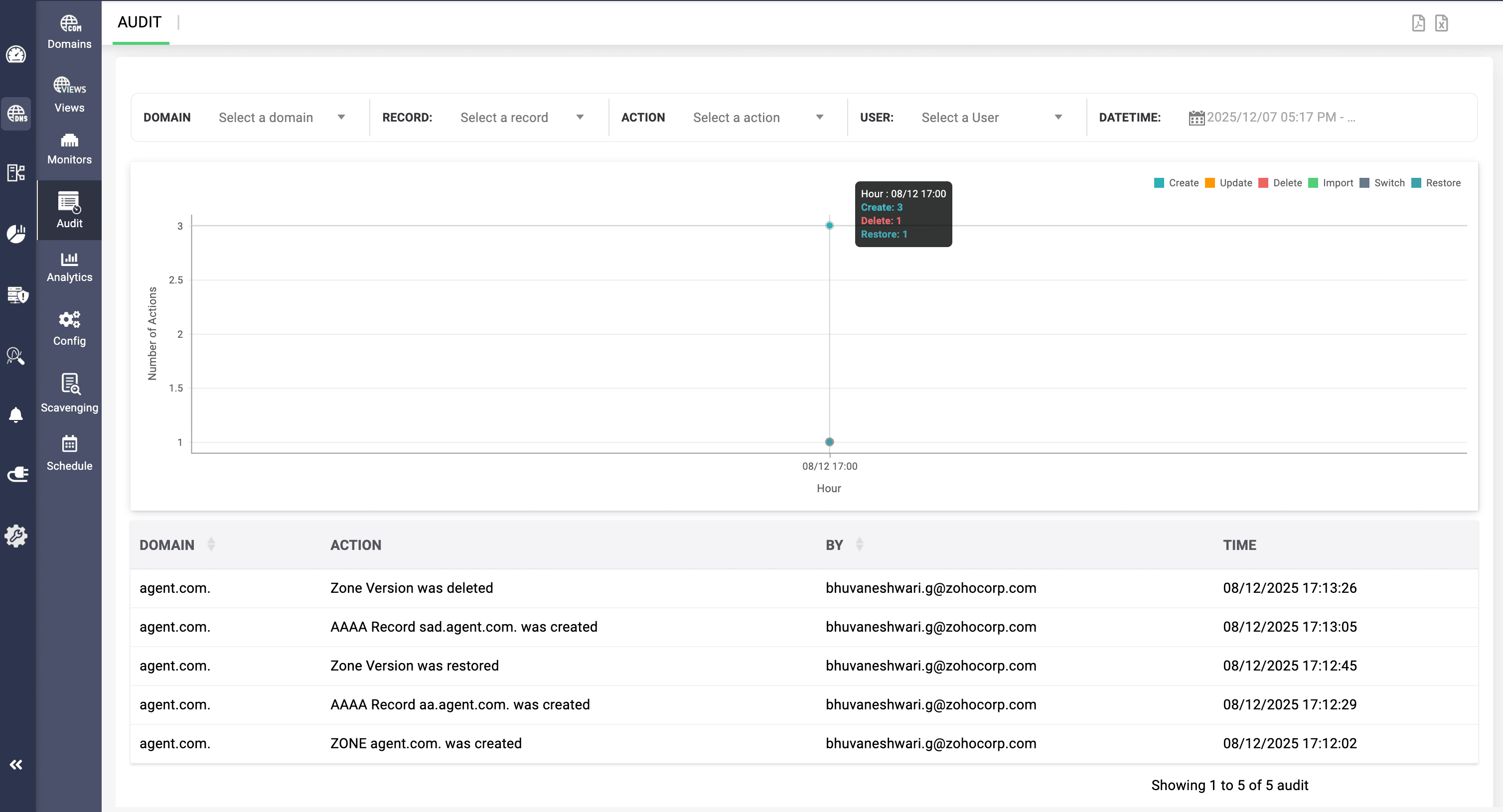 Figure 5.2: Change management at a glance—track DNS actions by domain, user, and timestamp from a single audit console.