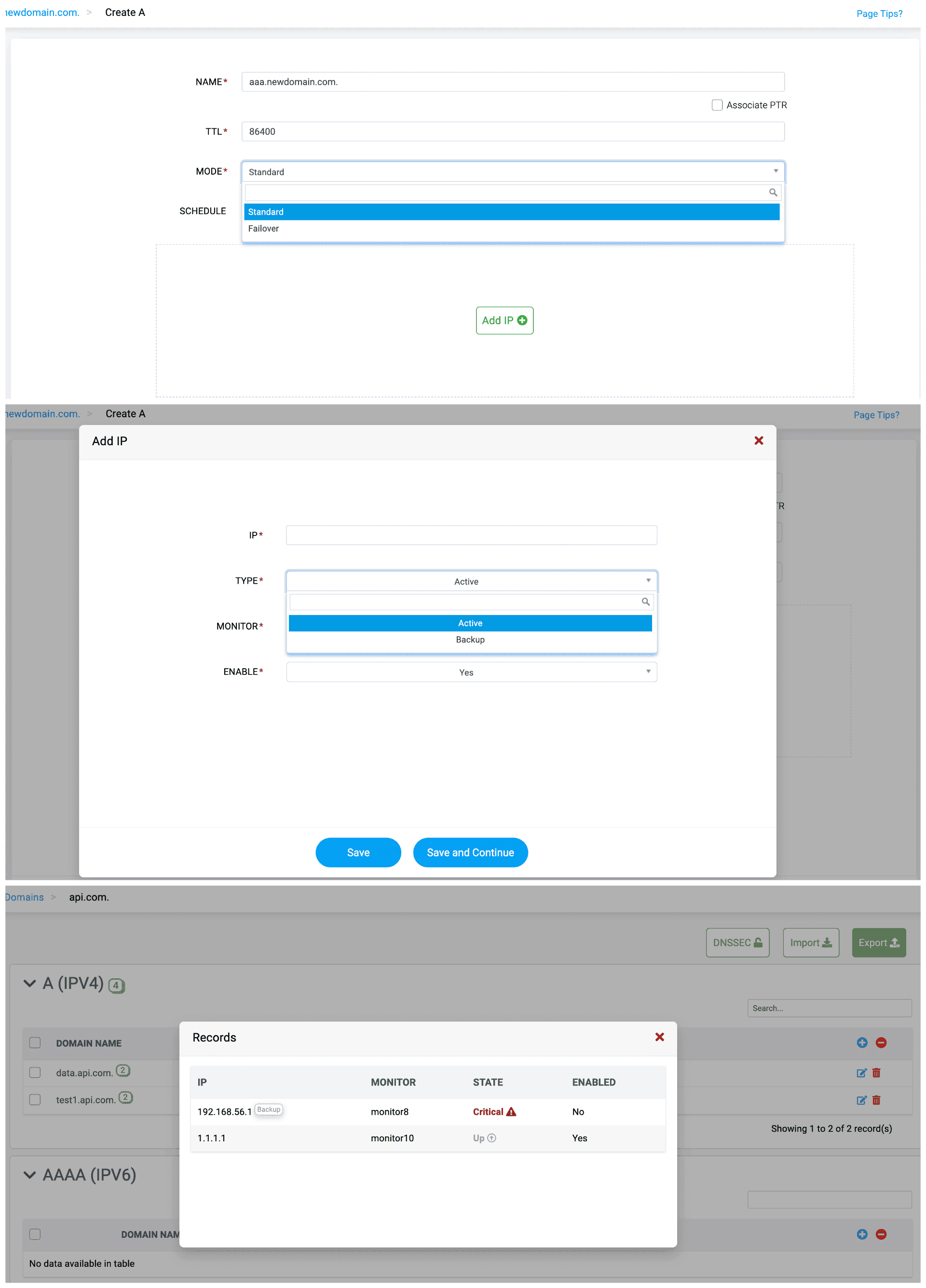 Behind the scenes, monitors attached to IPs ensure DNS only returns healthy endpoints and automatically fails over to backups when a primary goes critical. During maintenance, staged rollouts, or migrations, you can selectively enable or disable IPs so only chosen endpoints receive traffic—giving you DNS-level control over what resolves, and what stays dark, without sacrificing safety or uptime.