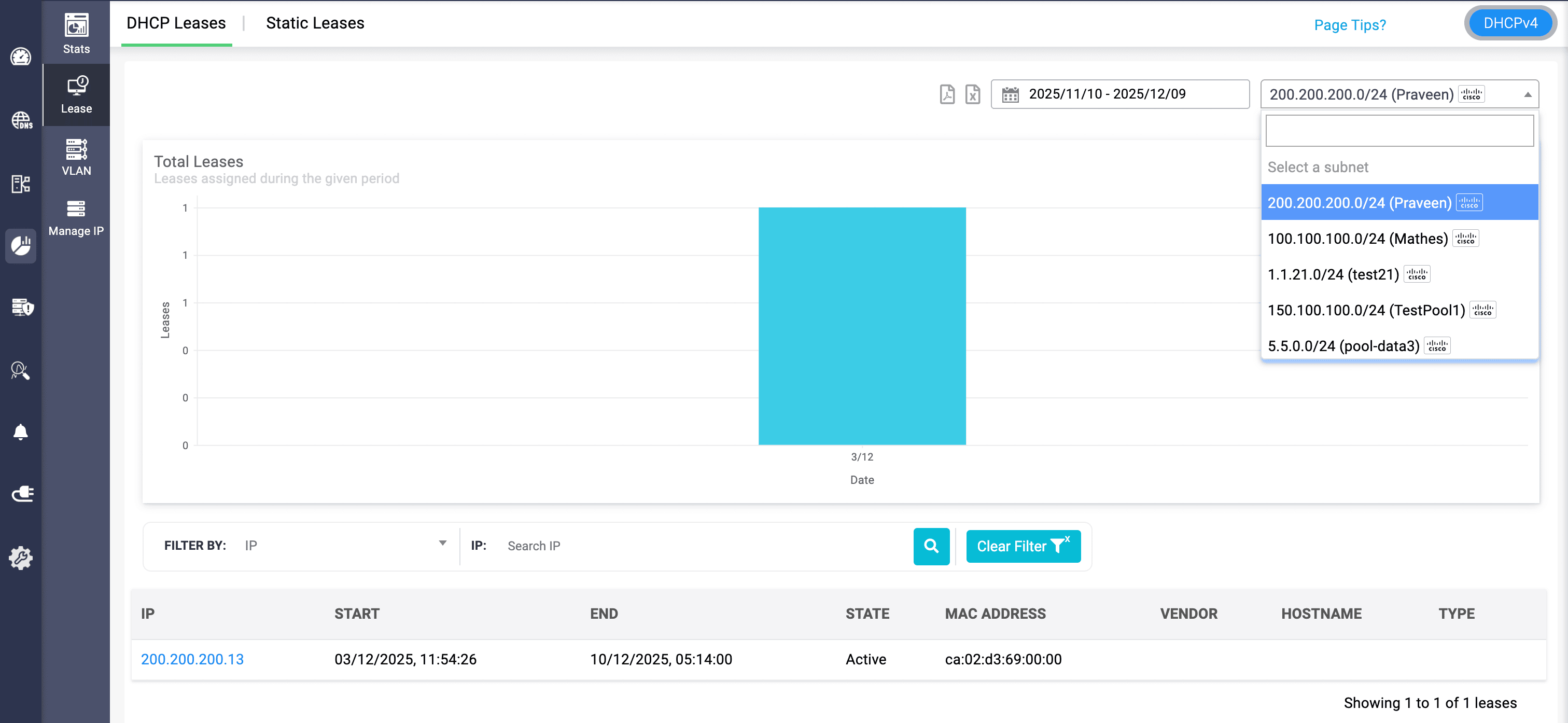 Figure 3.2: Drill into Cisco lease activity per subnet—see when an IP was leased, for how long, and to which MAC address.