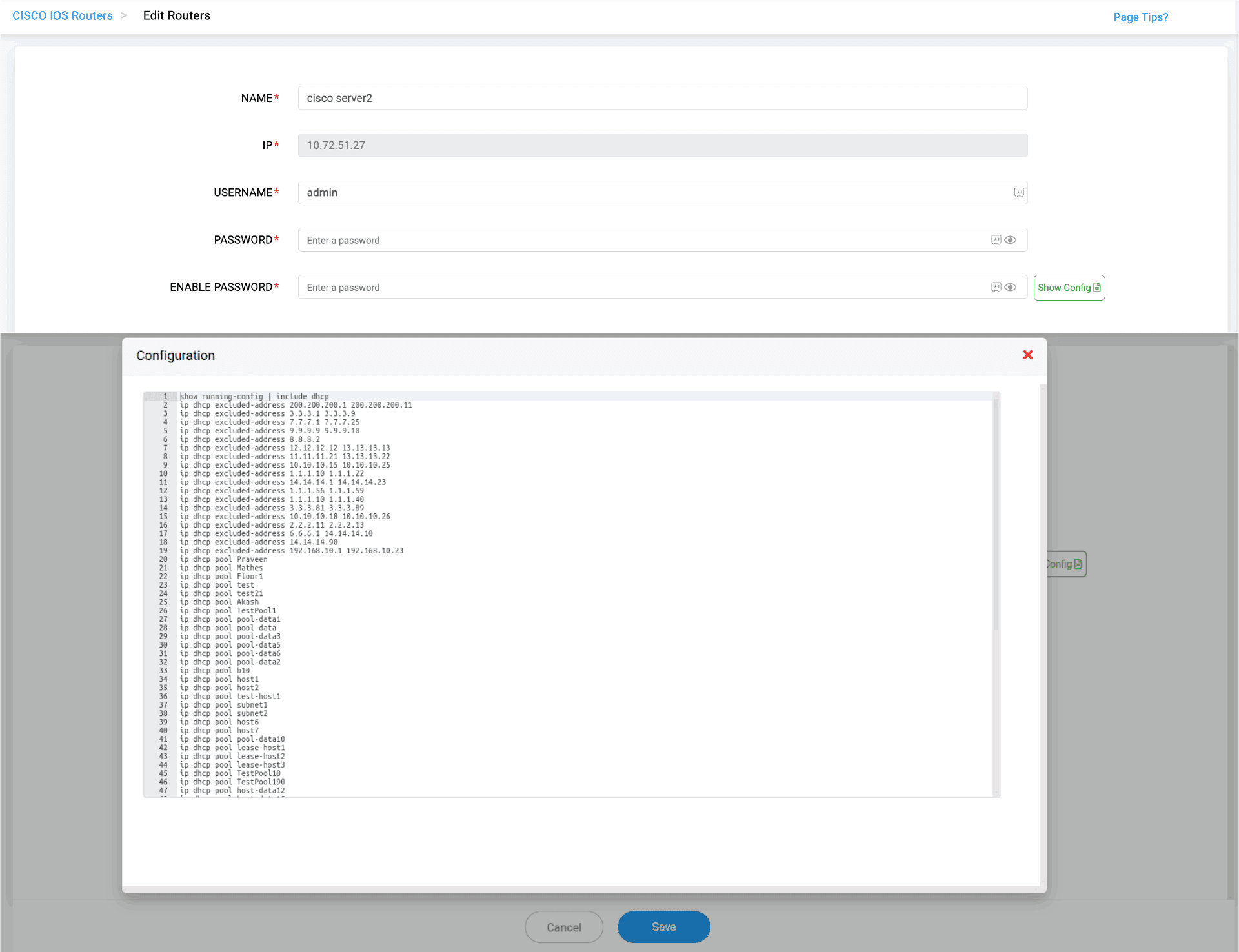 Store Cisco device credentials once and securely reuse them to pull live configuration snapshots on demand. Exclusions, pools, bindings, and reservations from multiple routers appear in a single view, so admins can validate DHCP rules and confirm that router configs actually match intent—without touching the CLI. Long-forgotten pools and stale exclusions are surfaced for safe clean-up, while built-in DHCP audit logs aggregate activity across routers for RCA, compliance, and incident reviews.