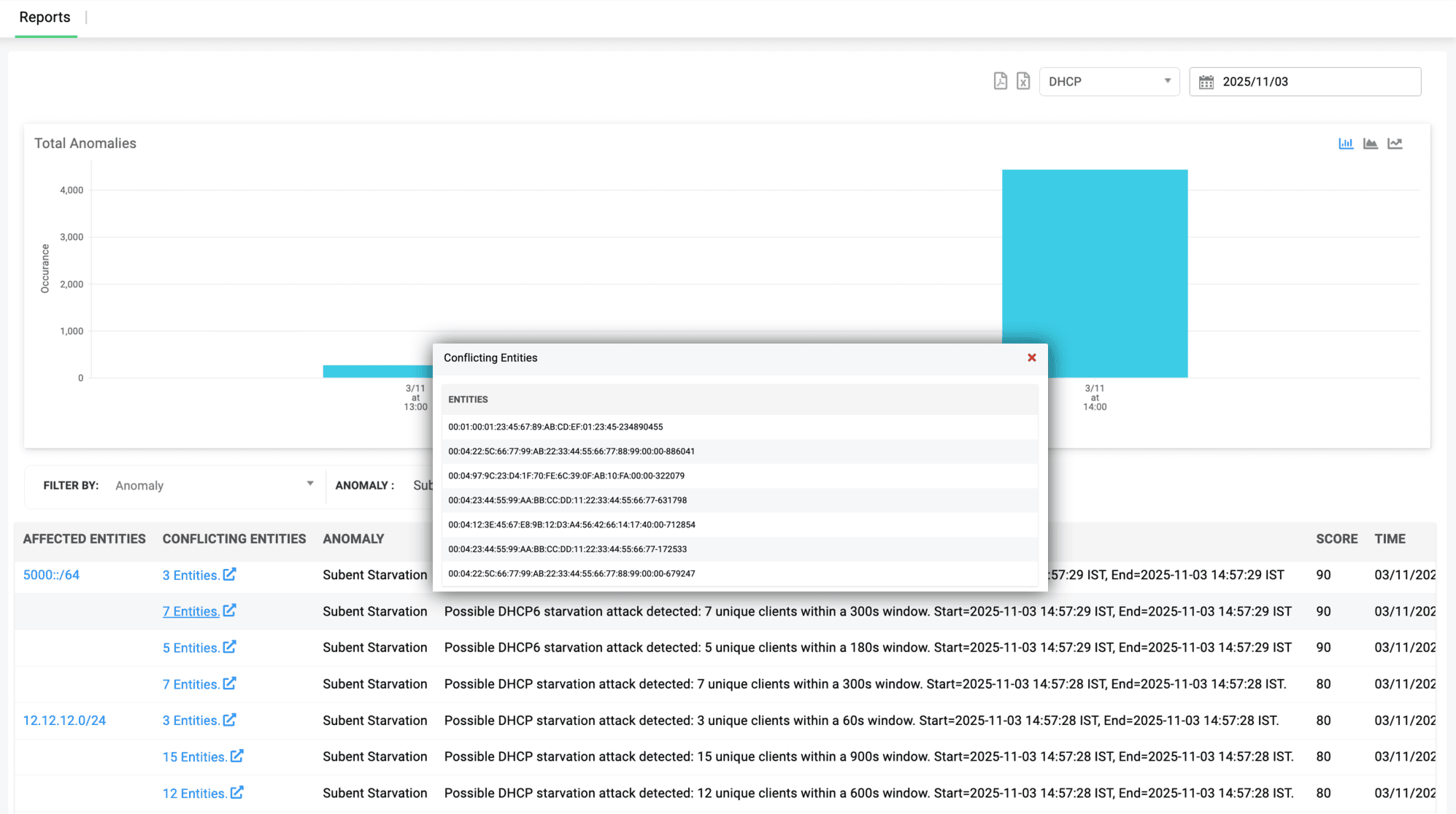 On the DHCP side, anomaly reports trace instability back to concrete causes such as duplicate DUID/IAID storms or subnet starvation attempts, collapsing thousands of events into a navigable set of offenders and conflict groups. Drill-down filters by score, type, cluster, or entity make it trivial to move from a global anomaly pulse to the single lease, MAC, or IP that broke the rules—without ever scraping logs.