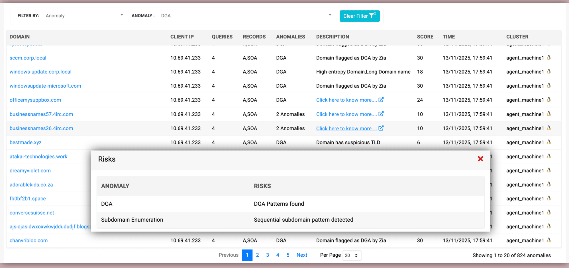 Figure 1.3: From anomaly label to root cause—popup risk details explain the exact patterns behind each suspicious domain.