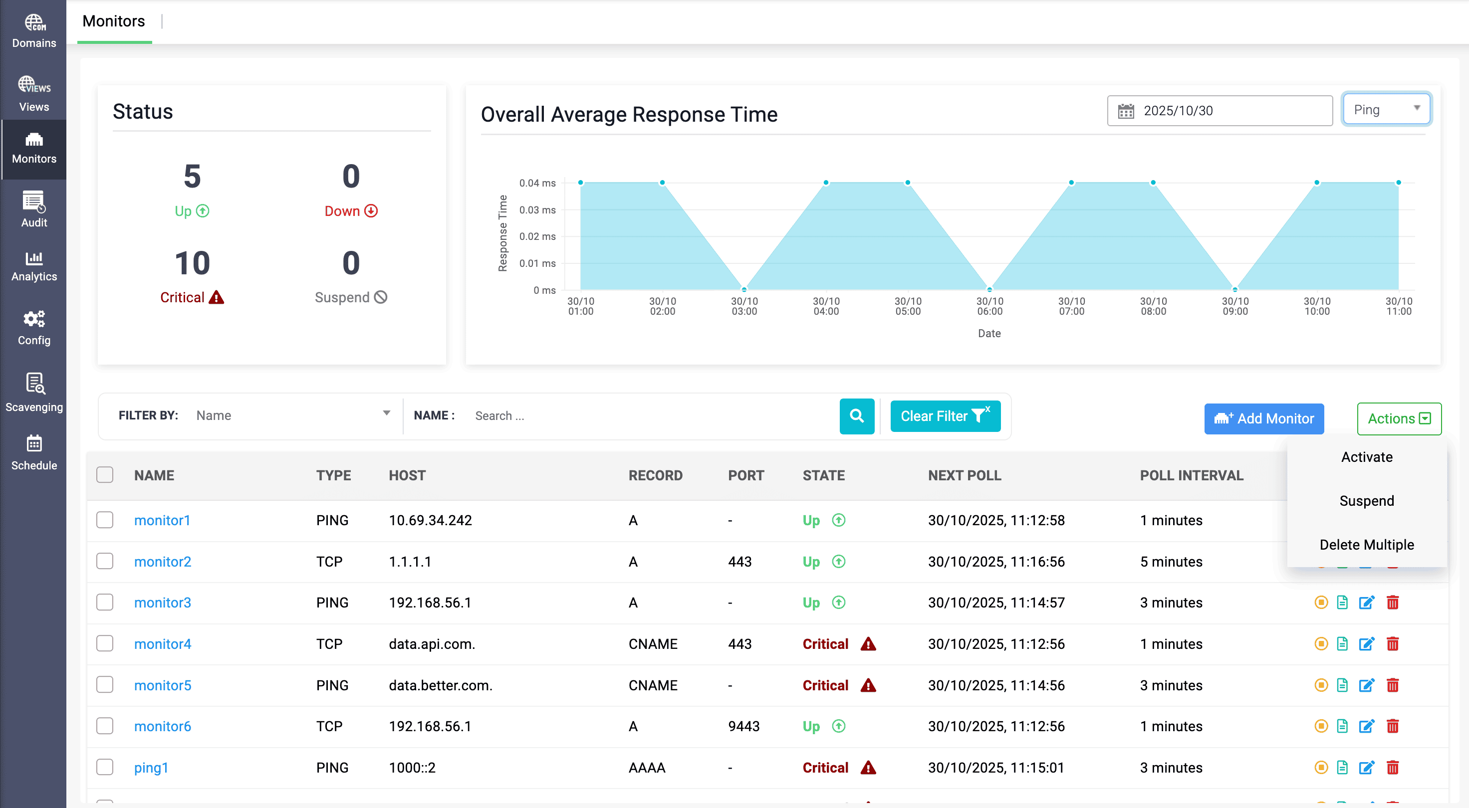 Instead of scattering health checks across scripts and tools, DDI Central brings all Ping and TCP monitors into a single console. You receive a real-time view of uptime and response across distributed endpoints, with response times, success/failure ratios, and availability plotted as clear timelines. Each monitor carries its full context—host, port, type, associated DNS records, and polling interval—so when something goes awry, admins instantly know what is failing, where, and how often, and can triage from the same screen without jumping between pages.