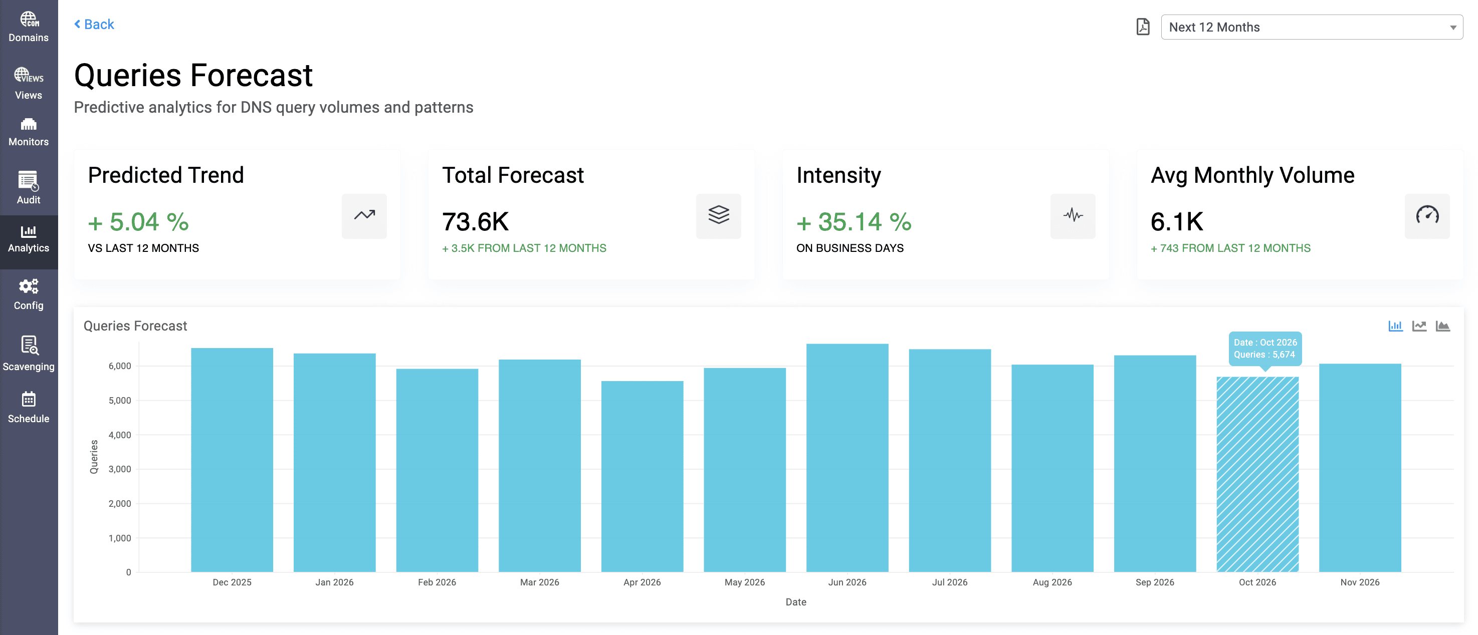 Time-series forecasts surface peaks, troughs, and recurring cycles on a clear timeline, helping you schedule maintenance during genuine low-traffic periods and scale resolvers ahead of predicted spikes. When you need precision, Forecast Now in the Analytics module generates predictive views for individual hosted domains—authoritative zones, response policy zones, and reverse zones—so you can right-size capacity at the zone level, not just at the server or cluster level.