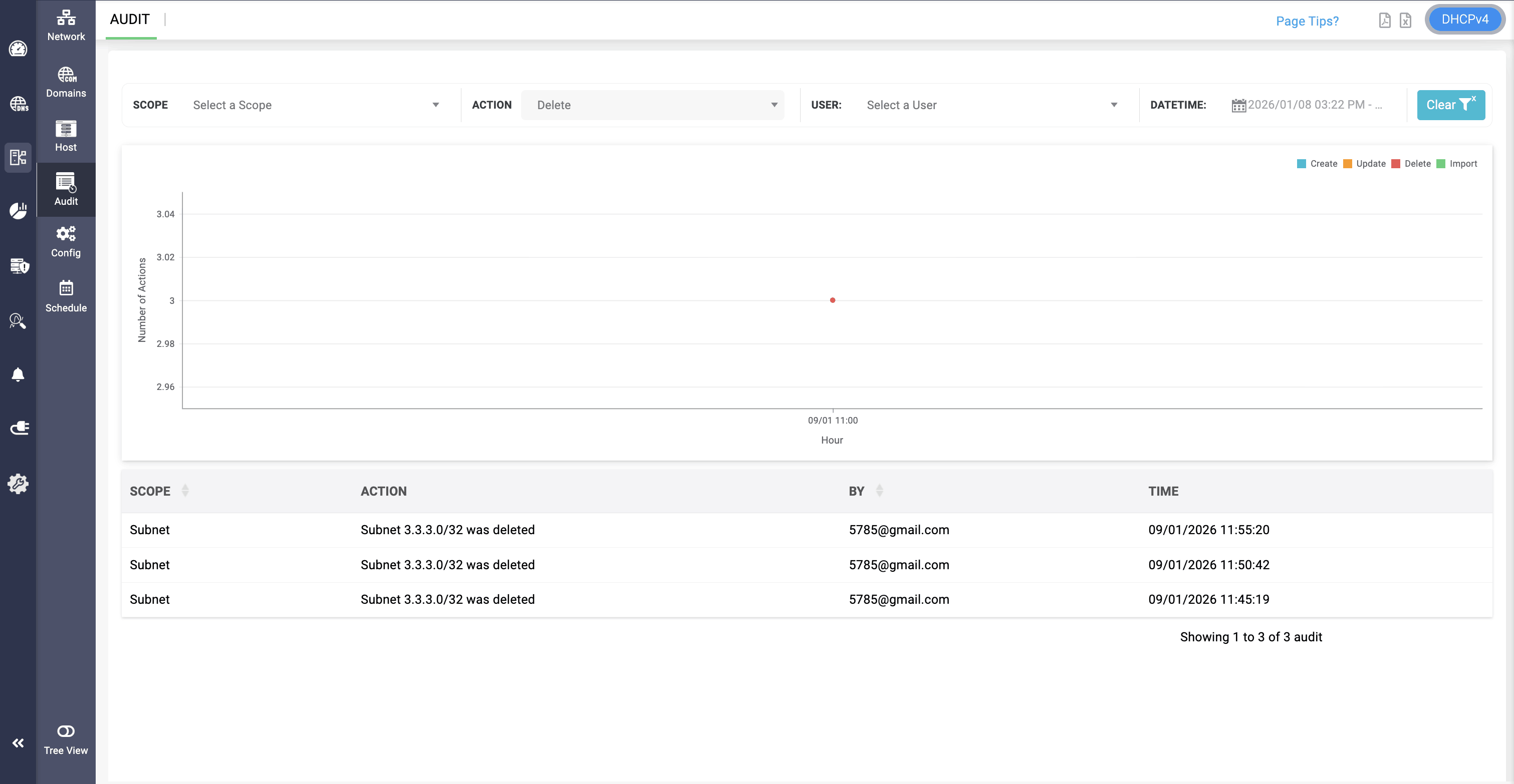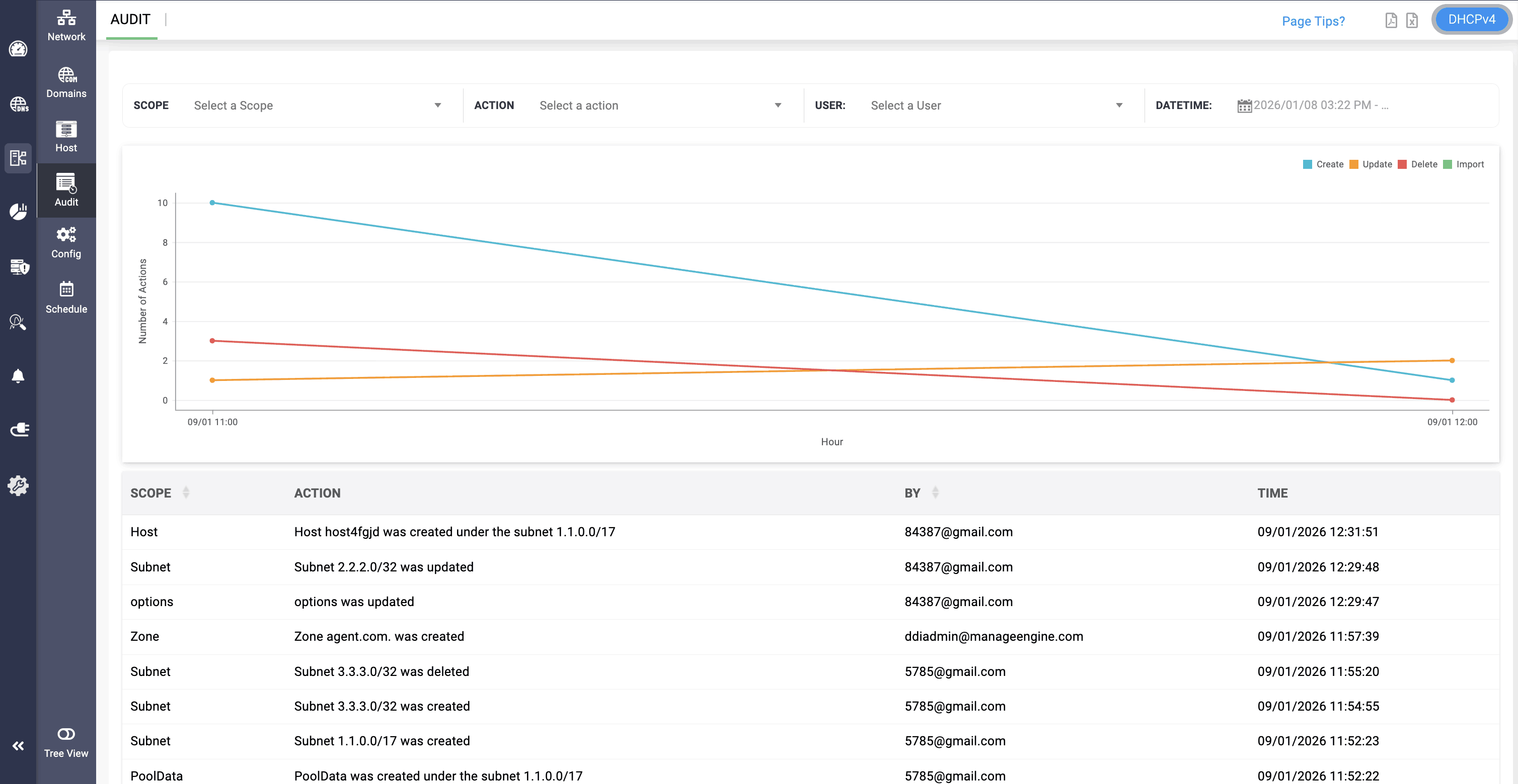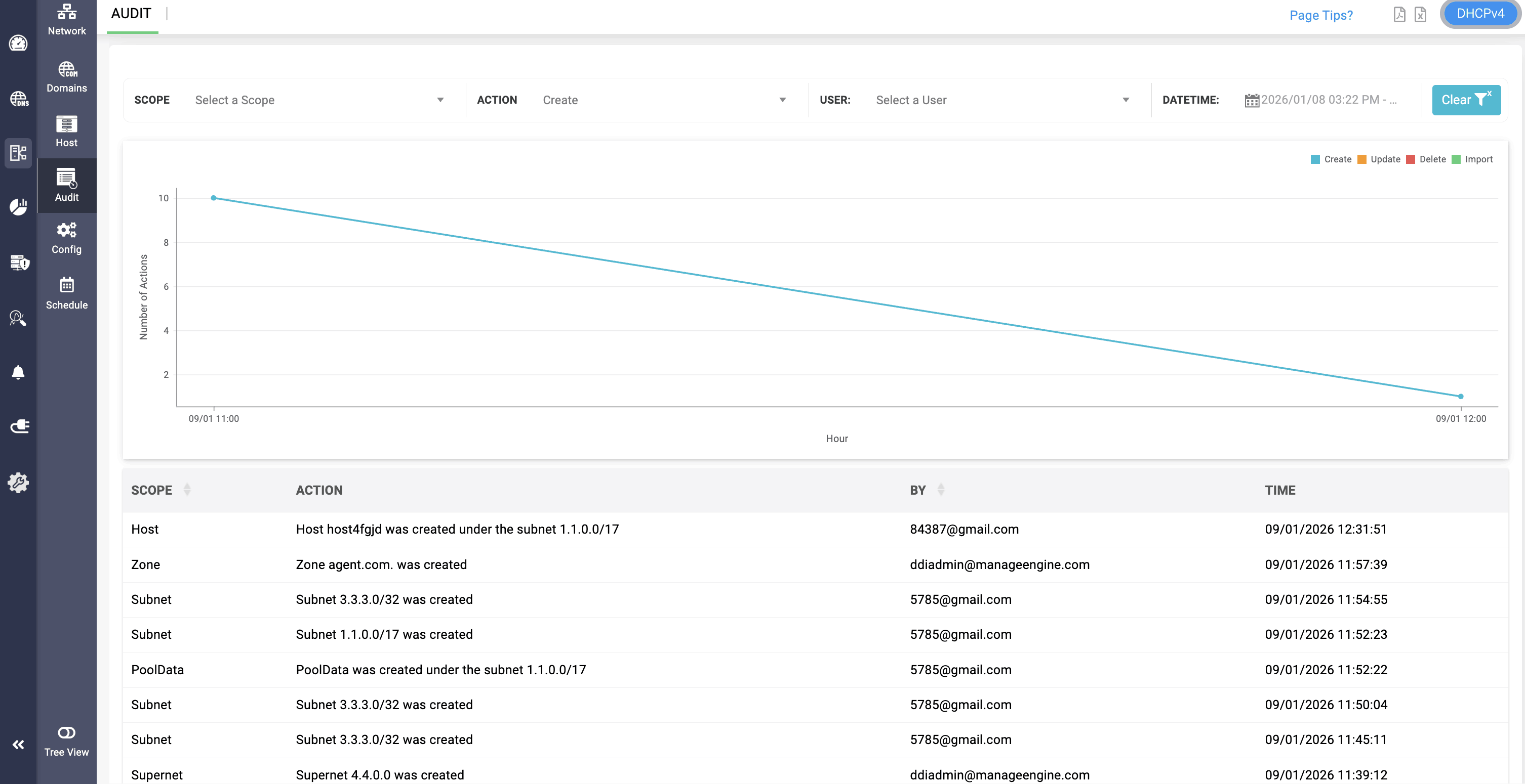 The DHCP scope audit logs page provides you an overview of the actions performed on each scope configured in your network. It help you to continuously evaluate the overall security posture of your scopes using security audit logs to track the who, what, and when with respect to each DDNS Zone, VLAN, Supernet, Custom Options, Options, Pool Data, Client Class, Host, Host Group, Shared Network and Subnet.