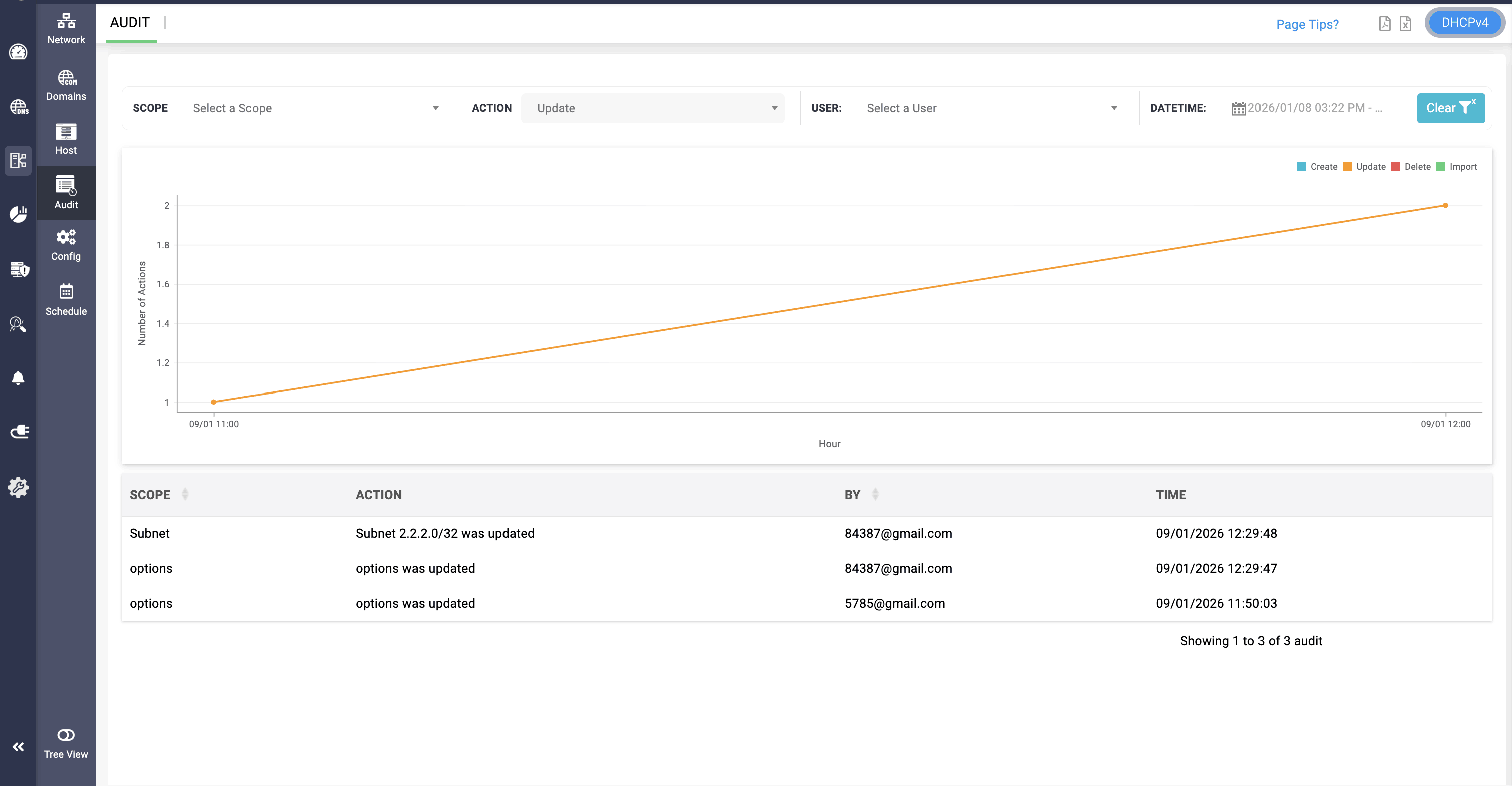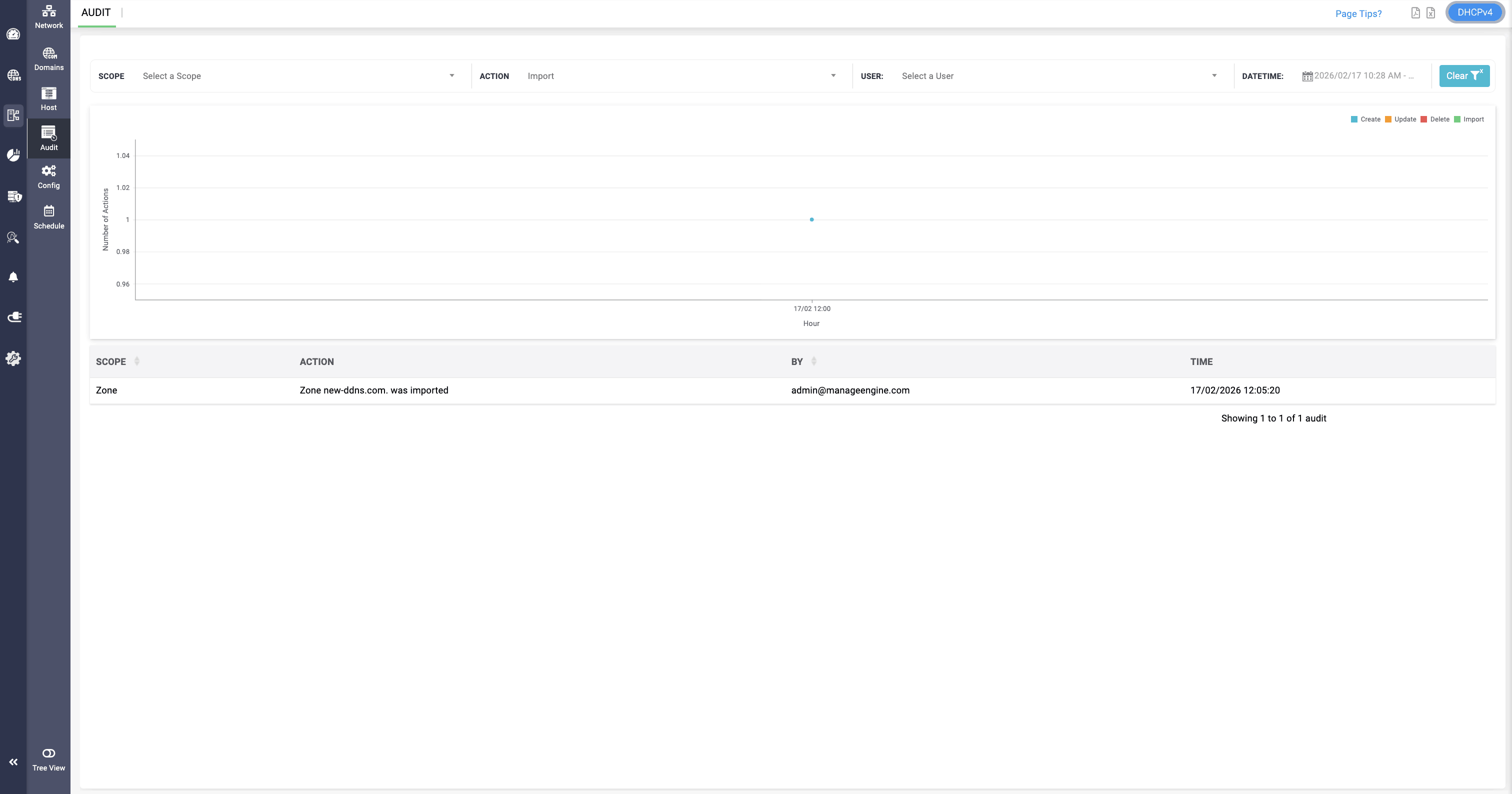 The DHCP audit log provides six different action-based filtering options, allowing network administrators to filter and view specific DNS activity logs across the network. This enables more focused visibility and streamlined monitoring. The following actions can be selected for review: