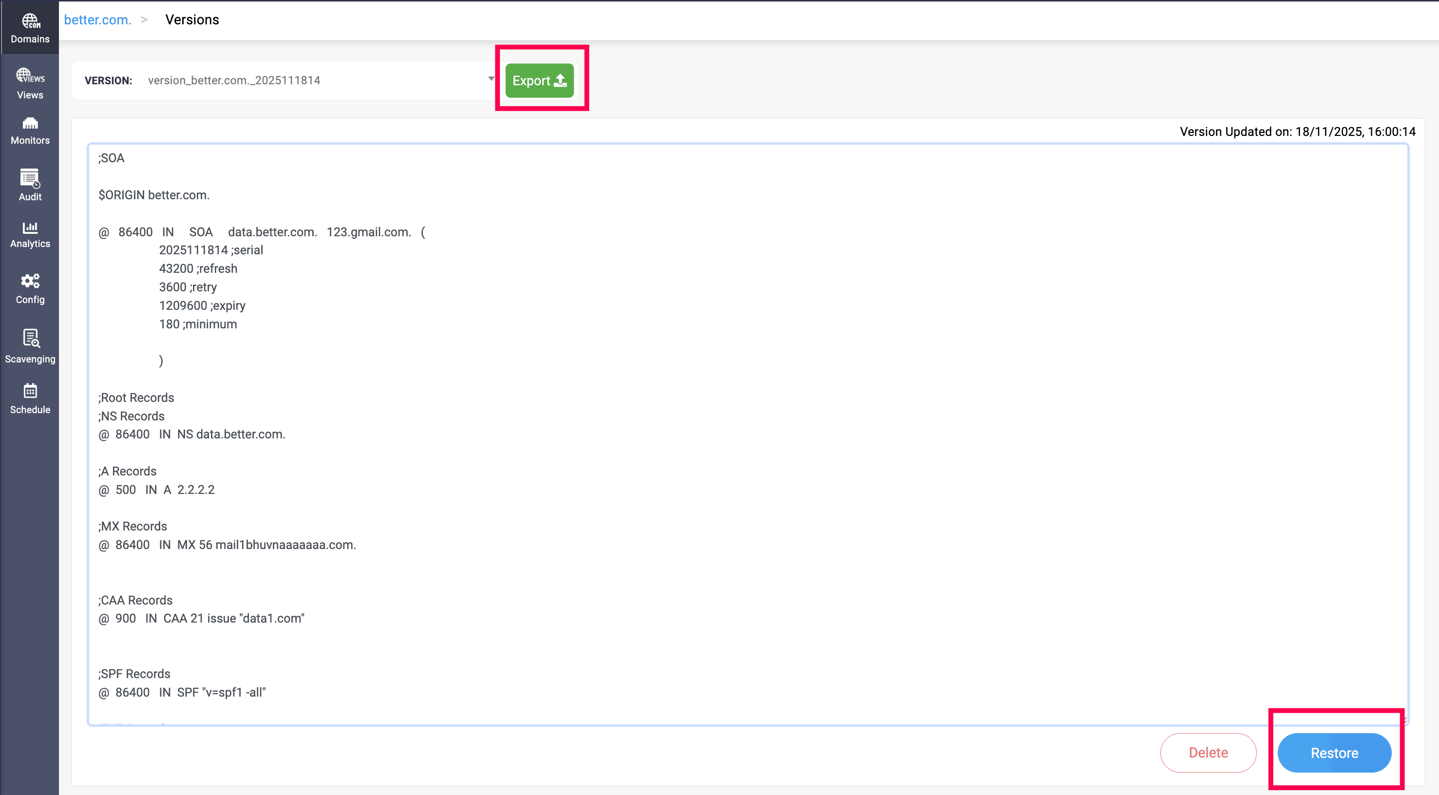 Zone versioning in DDI Central allows to view the previous versions of the zone, which can also be exported or restored as the current version.