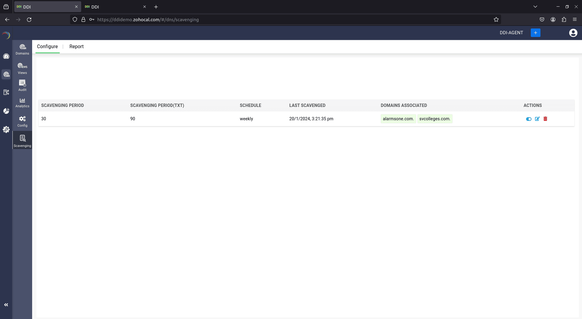 - On the Configure window that appears, the top field SCAVENGING PERIOD is meant for all the A, AAAA. CNAME, PTR of the domains selected. This is the duration after which a DNS record becomes eligible for scavenging if it has not been refreshed. If the DNS record still remains un refreshed after this period, DNS server considers the record stale and eligible for deletion and put up in the report for the user to delete or reclaim it .