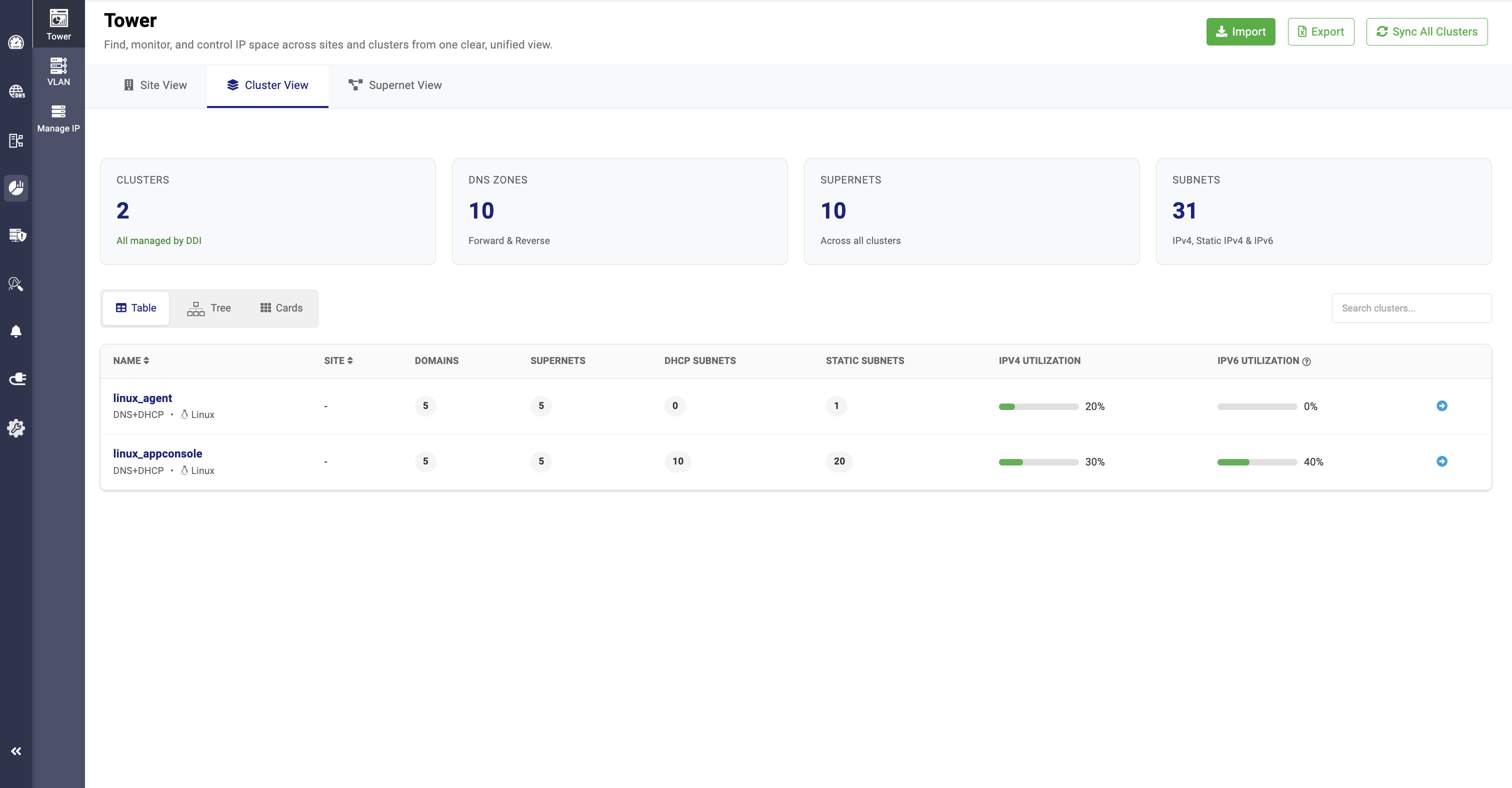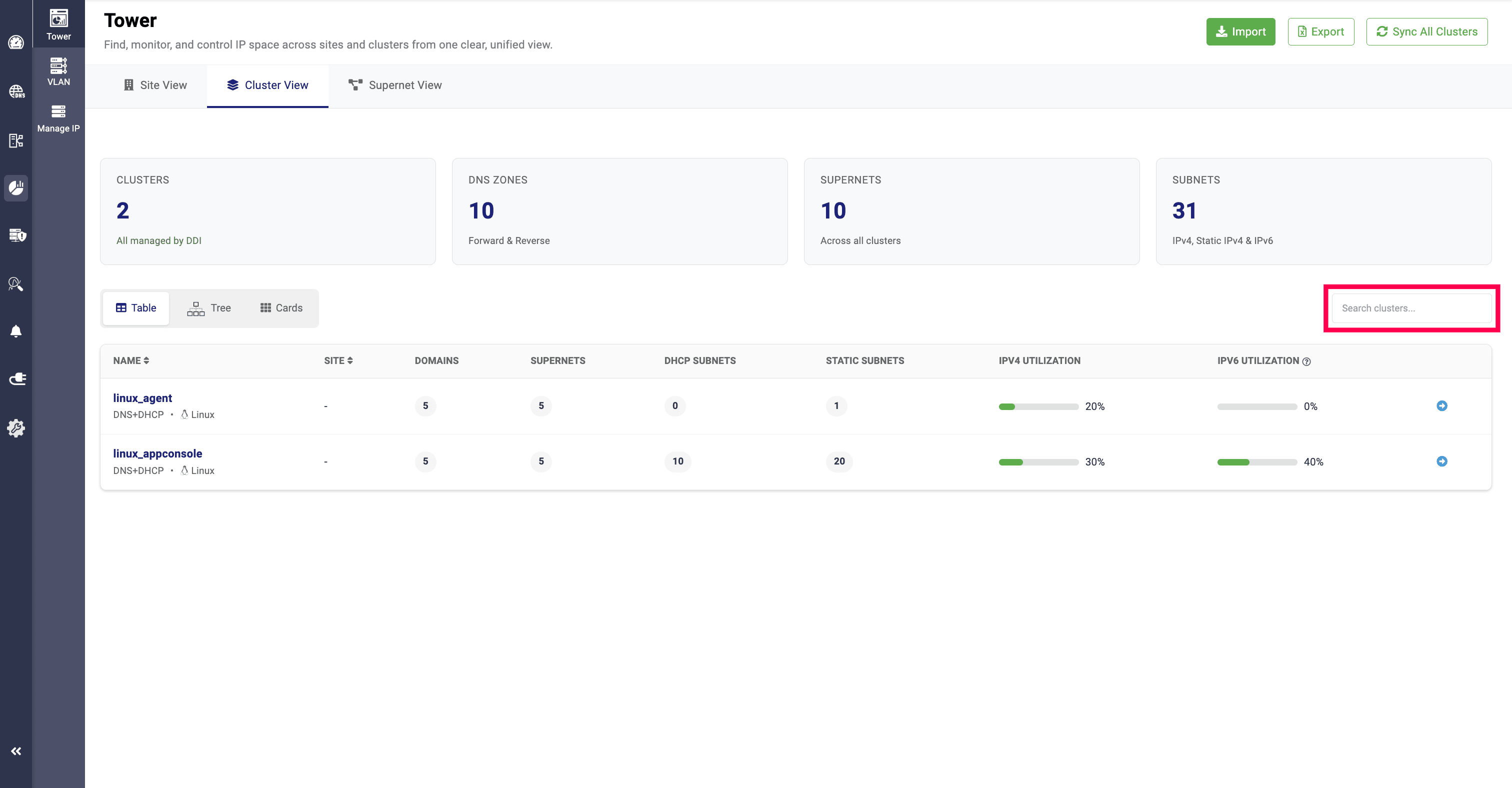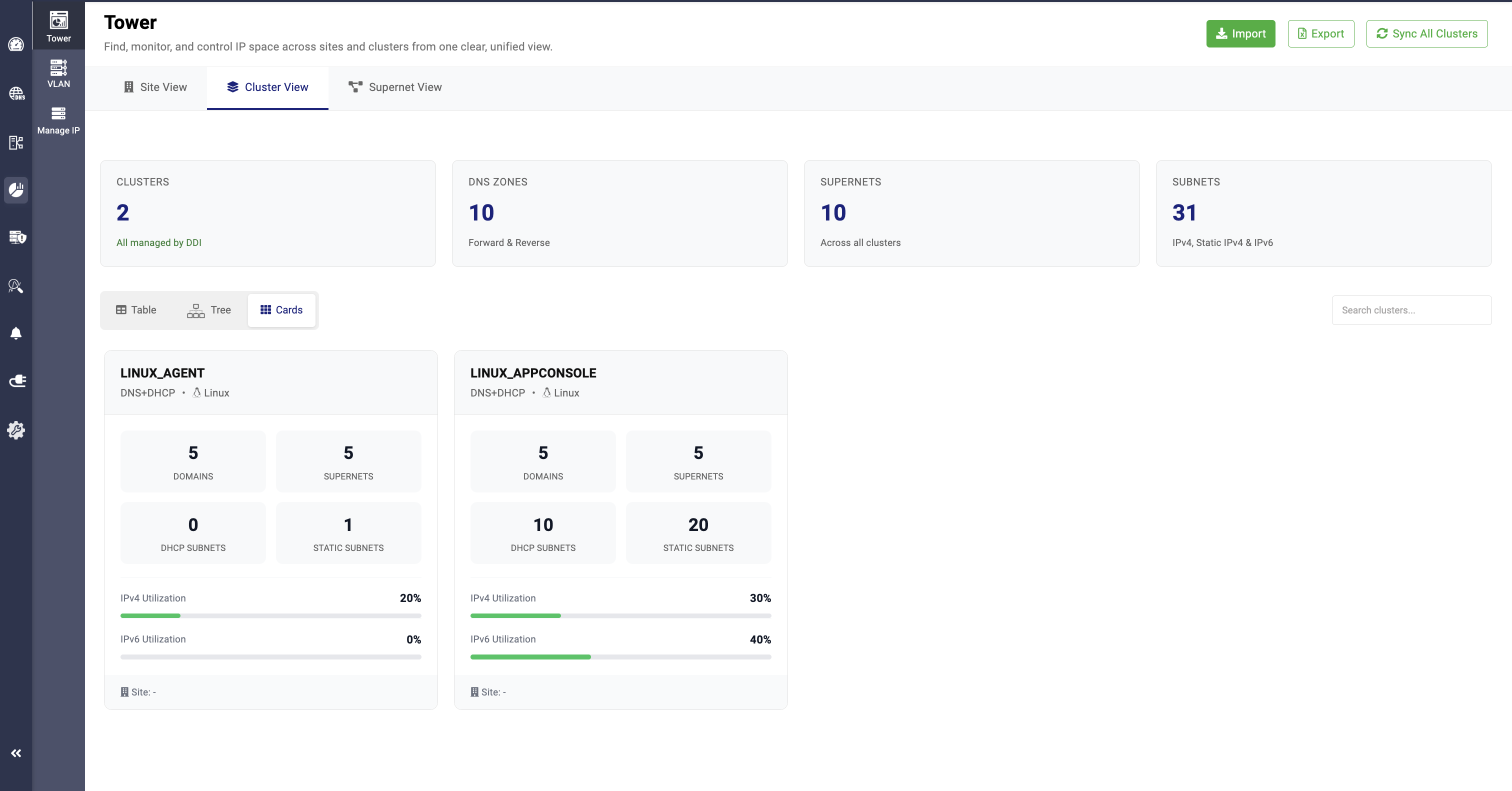 In the Cards View, network admins can get segmented visibility of the total clusters, the services allocated to them (DNS, DHCP, or DNS + DHCP), the sites they are associated with, domains, supernets, subnets, and static subnets. It also displays IP utilization and the supernet values along with their respective usage.