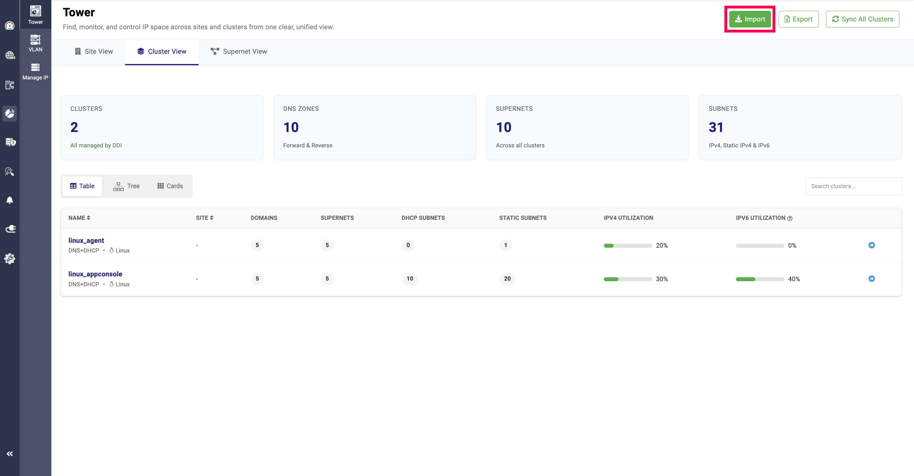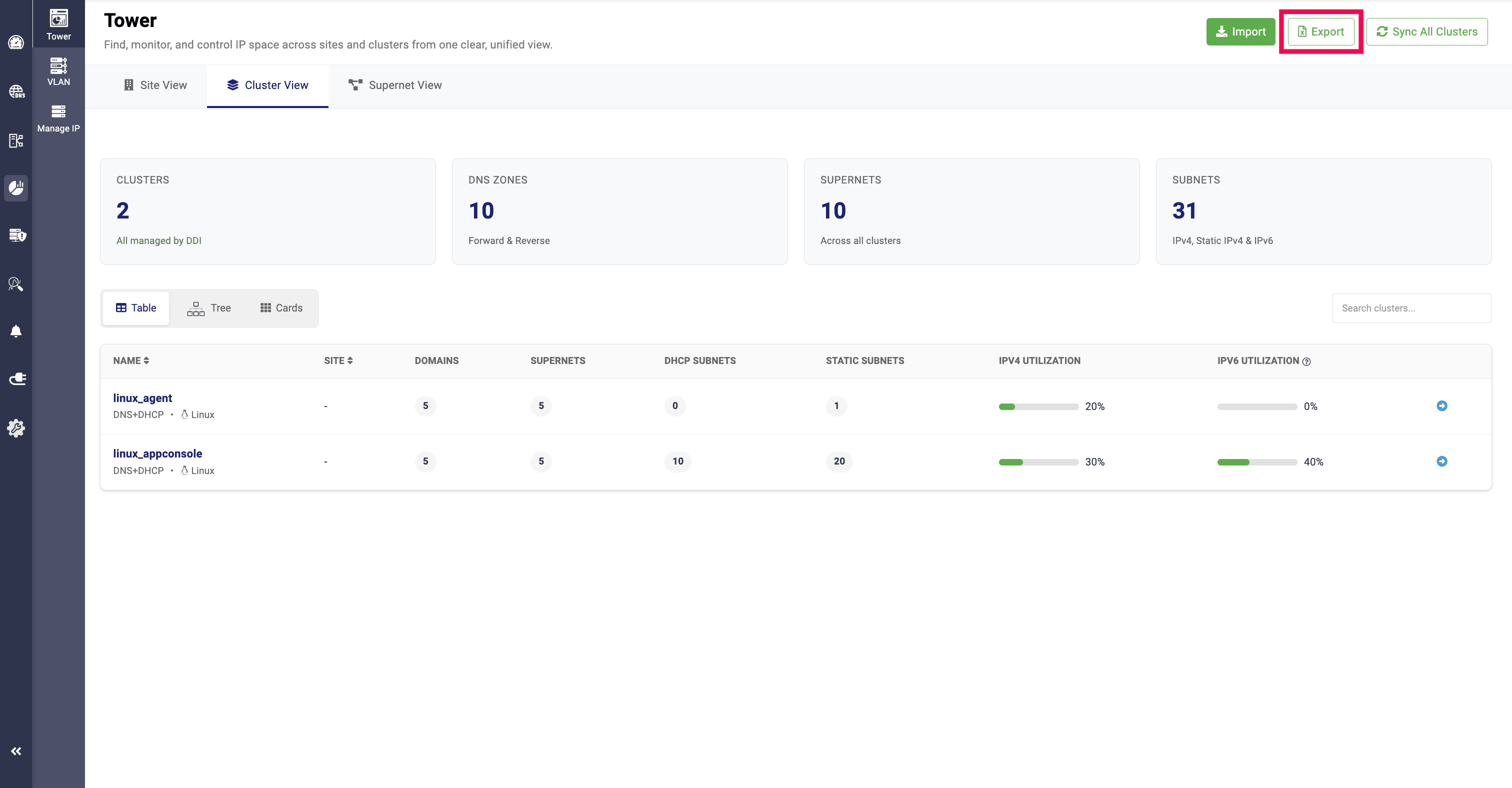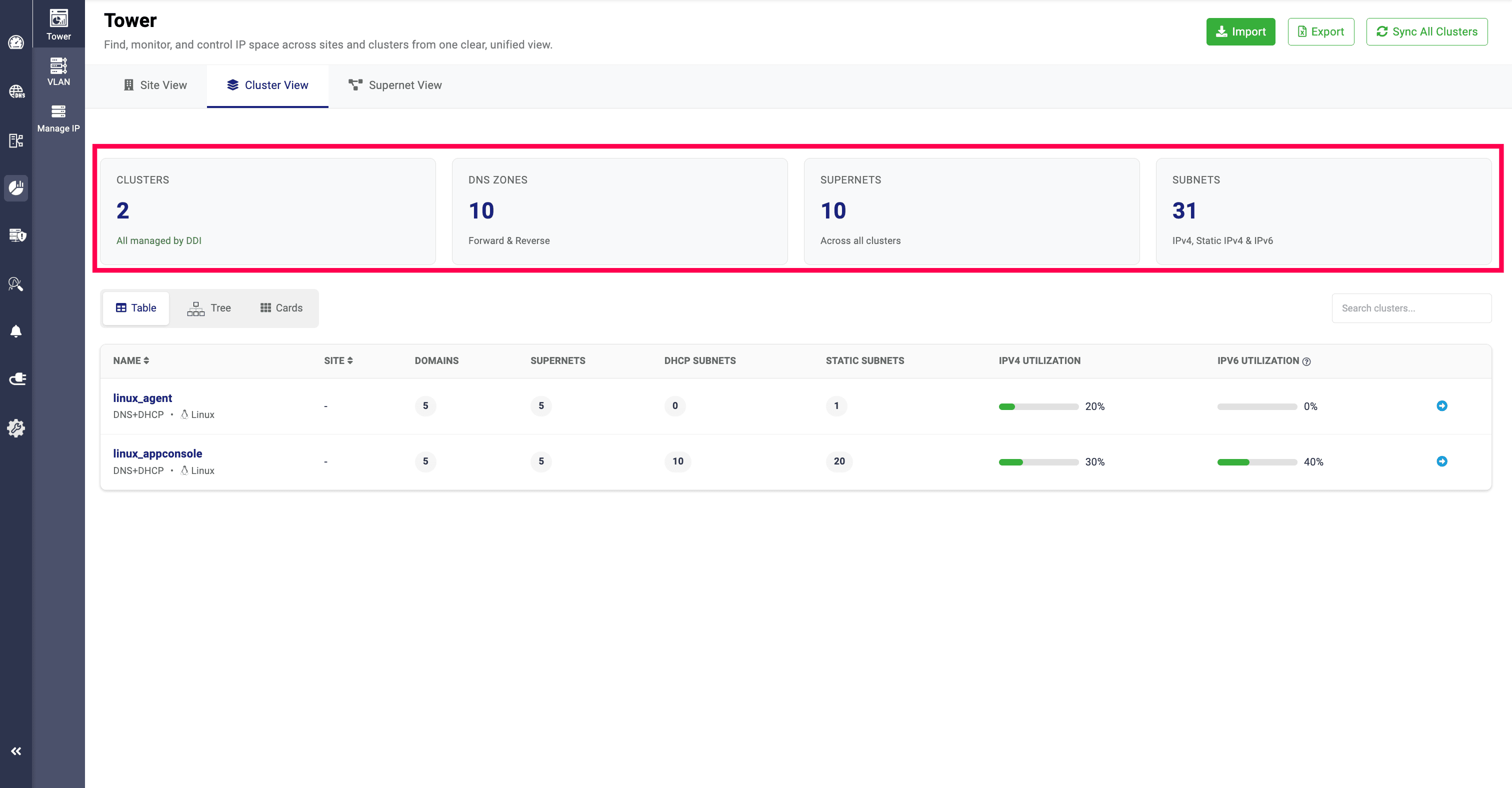 In the Cards View, network admins can get segmented visibility of the total clusters, the services allocated to them (DNS, DHCP, or DNS + DHCP), the sites they are associated with, domains, supernets, subnets, and static subnets. It also displays IP utilization and the supernet values along with their respective usage.