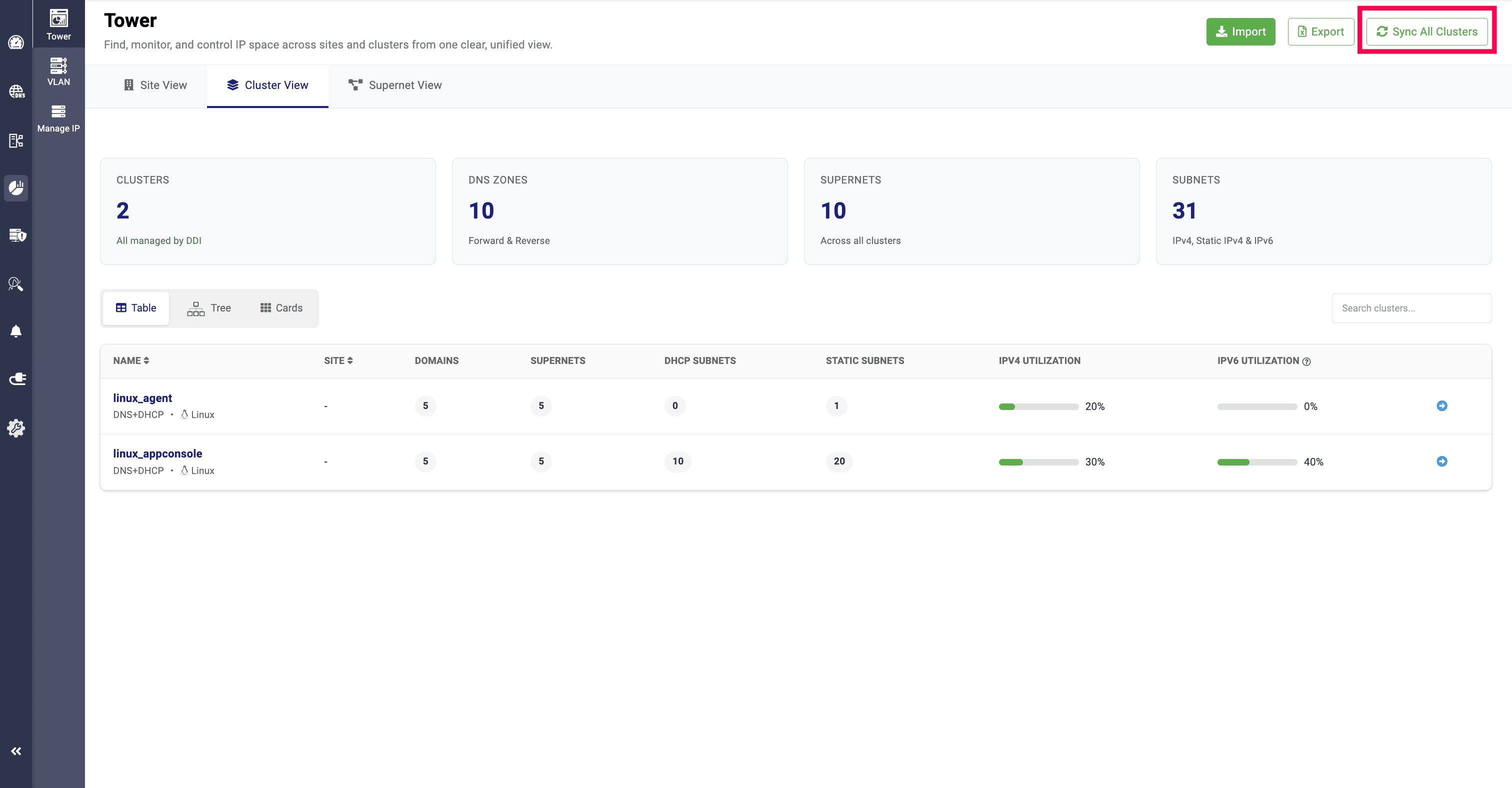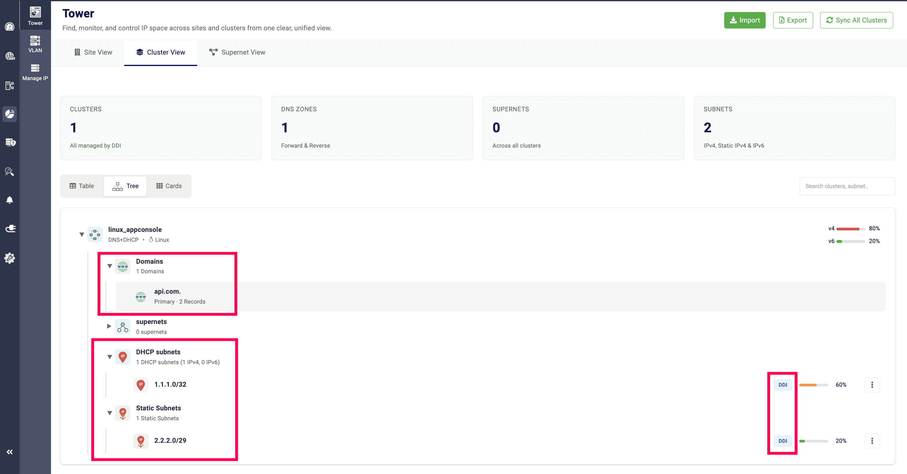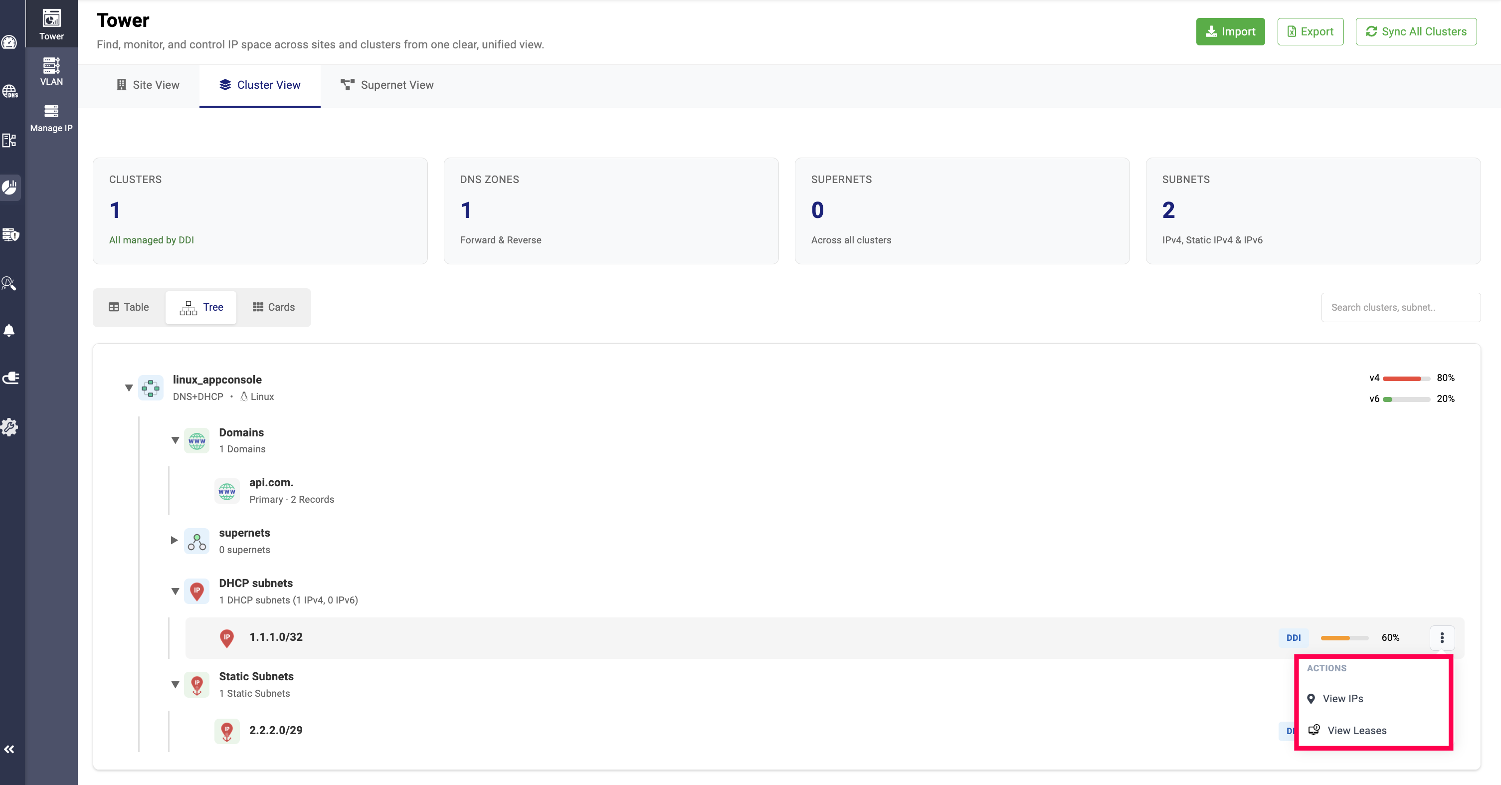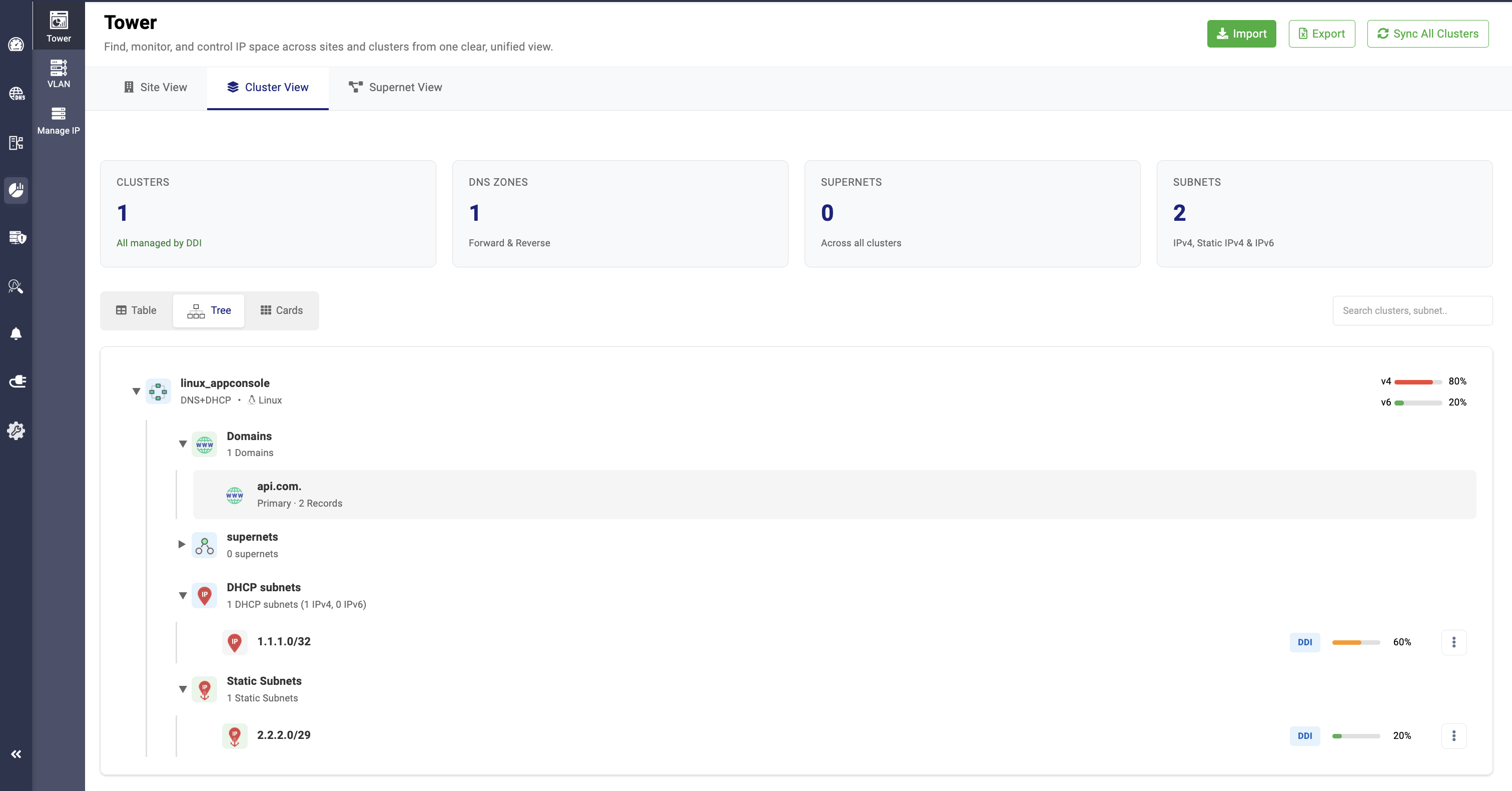 The Tree View provides a hierarchical arrangement of all added clusters, including the services allocated to them (DNS, DHCP, or DNS + DHCP), the sites they are associated with, the domains under each cluster, the supernets under the sites, and the corresponding subnets and static subnets.