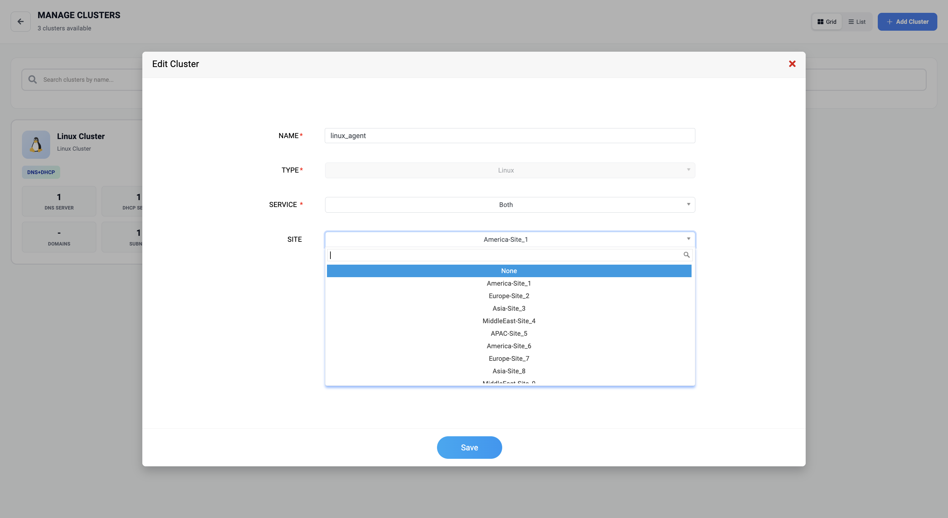 By clicking the Add Site option, you can create multiple sites and associate multiple clusters under a single site. However, a cluster cannot be associated with more than one site.