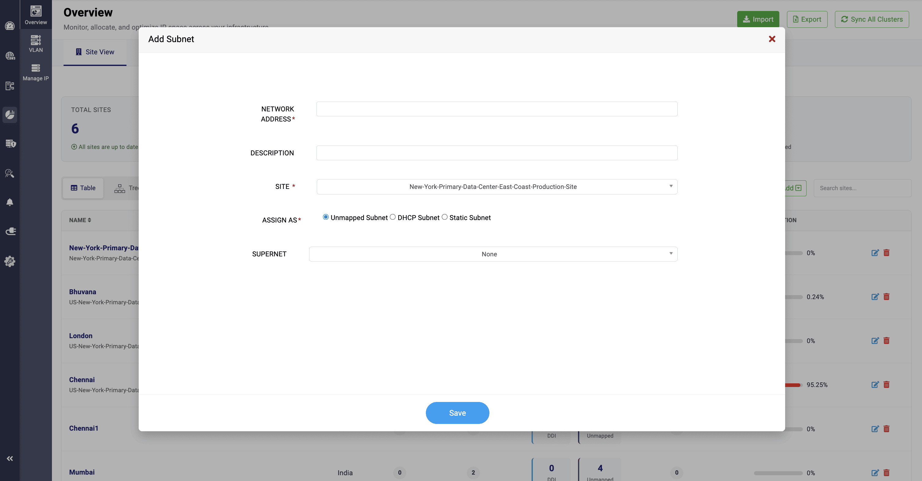 Here, you can provide the subnet’s network address and description, select the site you want to associate it with, assign it as an Unmapped subnet, DHCP-managed subnet, or Static subnet, and allocate a supernet for the subnet.