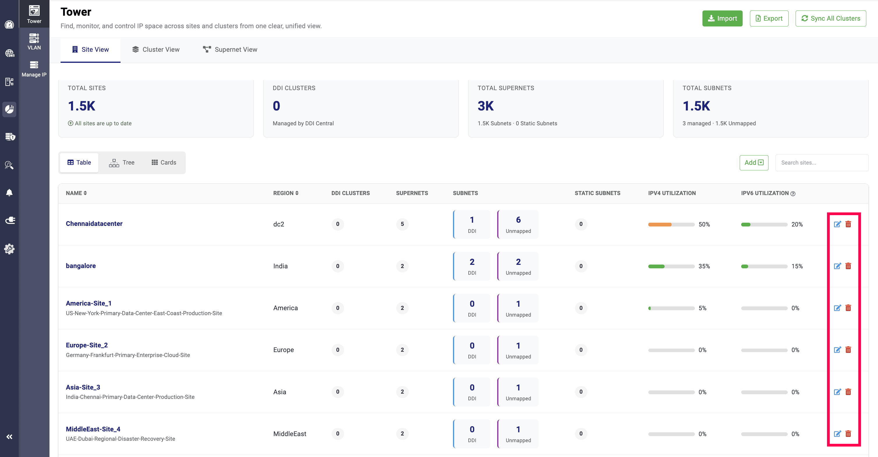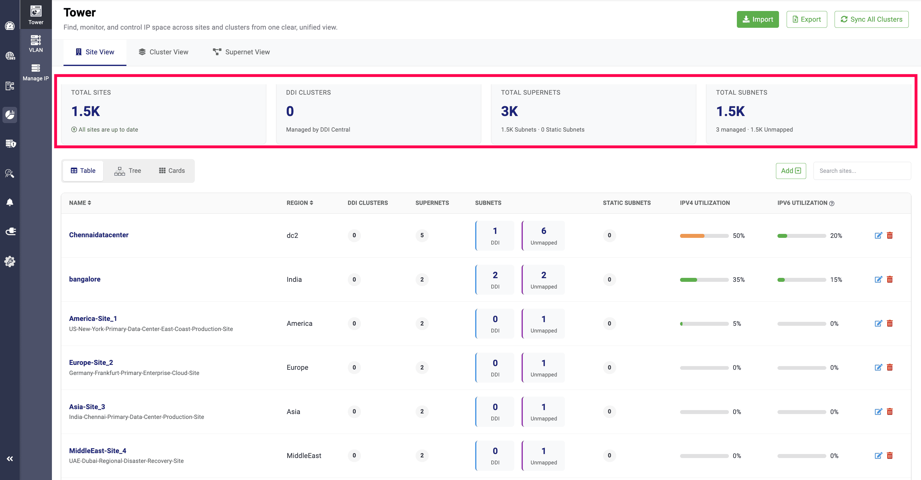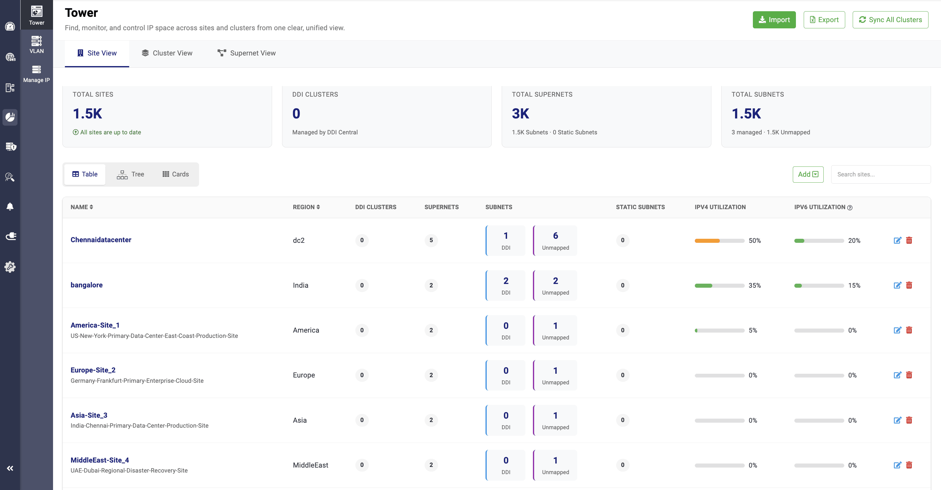 In the Table view, all sites are displayed along with their names, associated regions, total clusters managed by DDI Central, and total supernets. Subnets that are created and associated with sites are displayed as DDI, while subnets that are imported and not associated with any clusters are displayed as Unmapped.