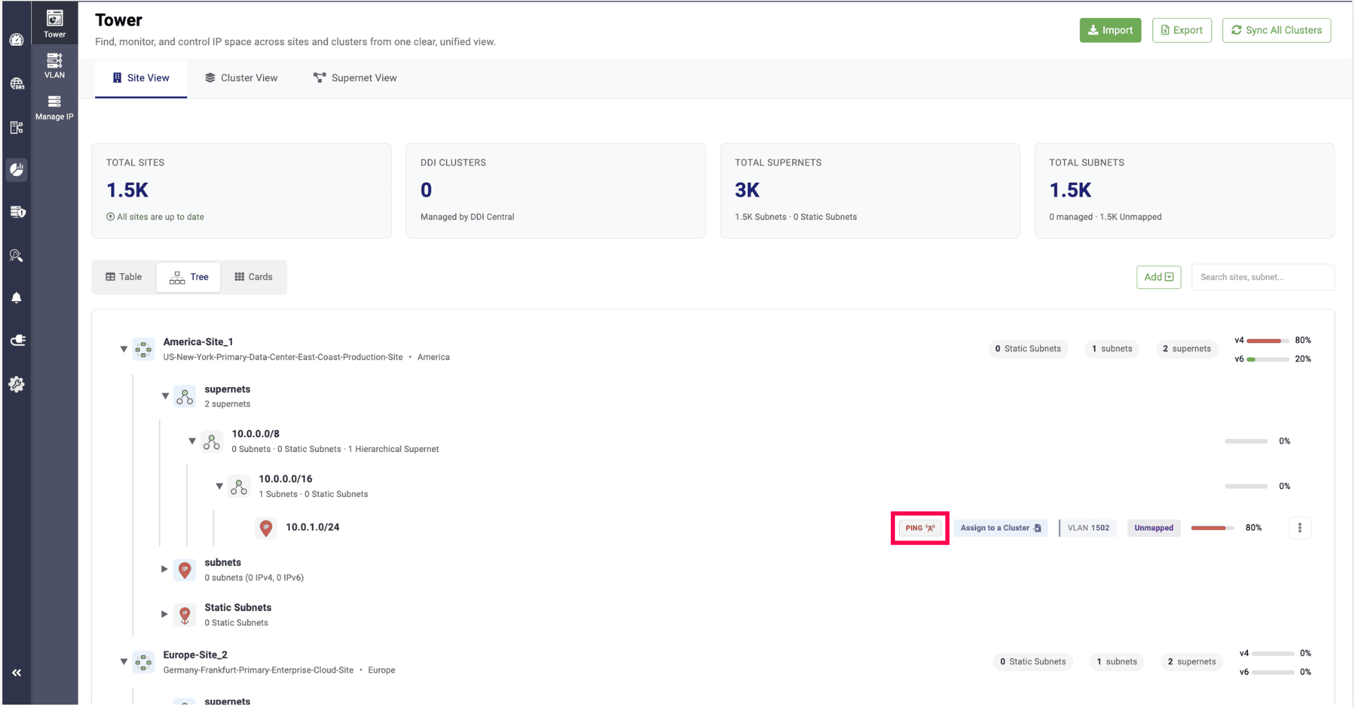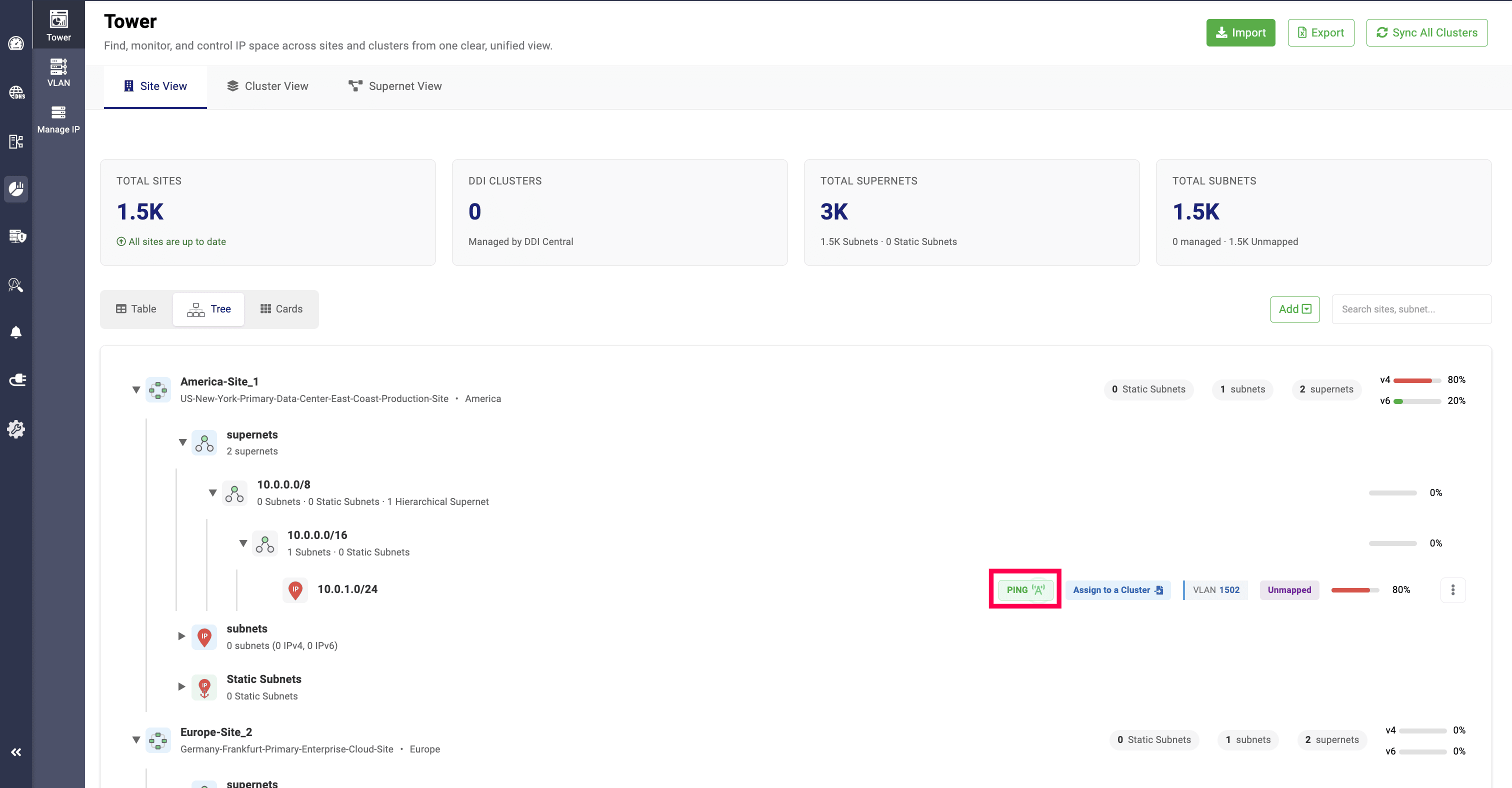 In addition, the total number of static subnets within each site is displayed, and IP utilization is shown as a percentage.