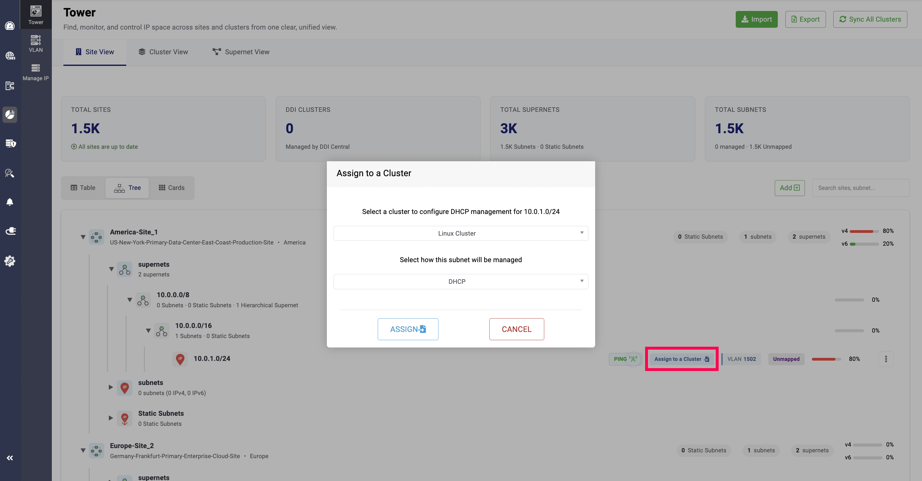 Clicking the Add Subnet option allows network administrators to add specific subnets under the clusters associated with the selected site.