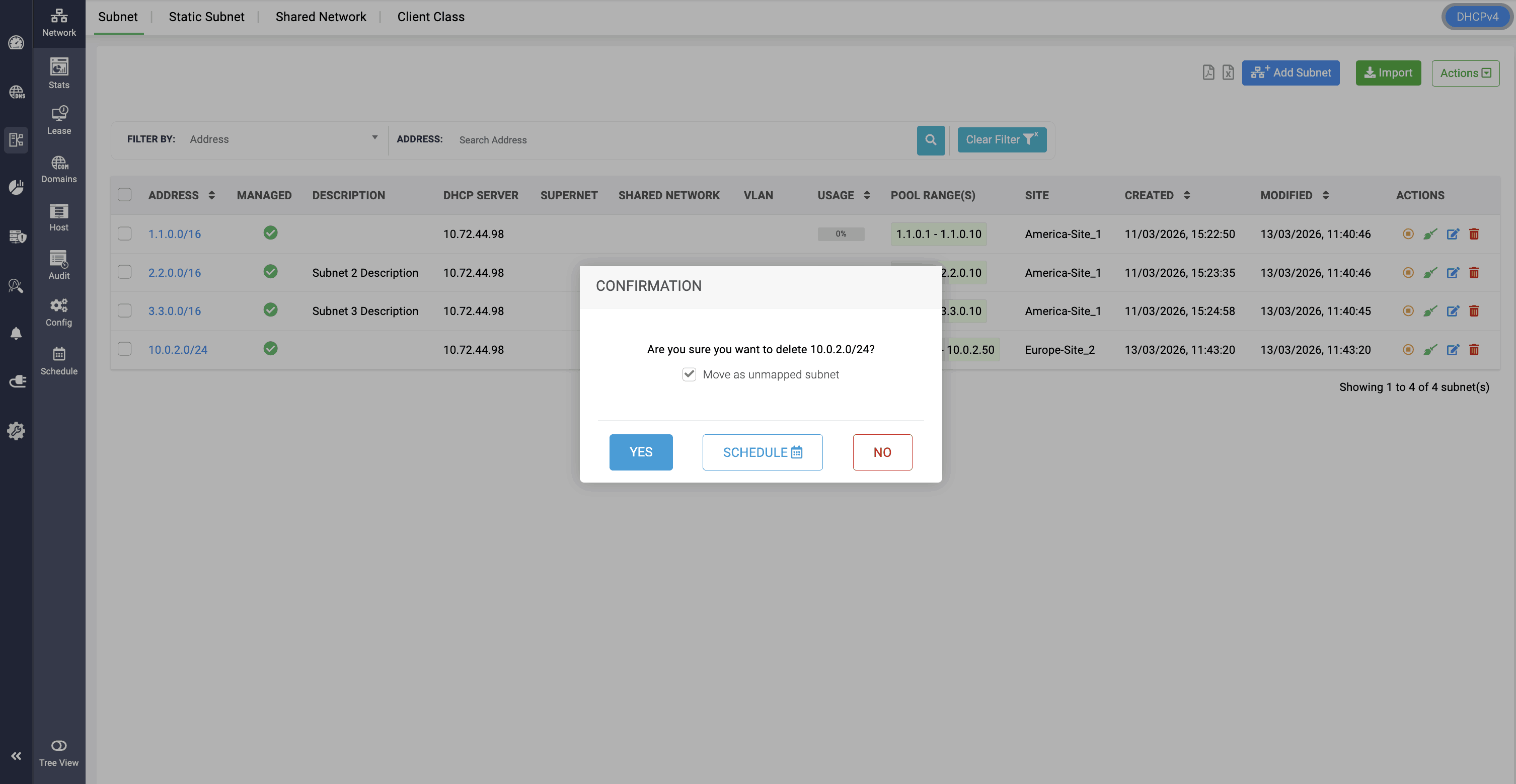 The same subnet can be unmapped from the assigned cluster by navigating to DHCP > Subnets, clicking the Delete icon, and selecting Move as Unmapped Subnet. Alternatively, you can delete the subnet from the network.
