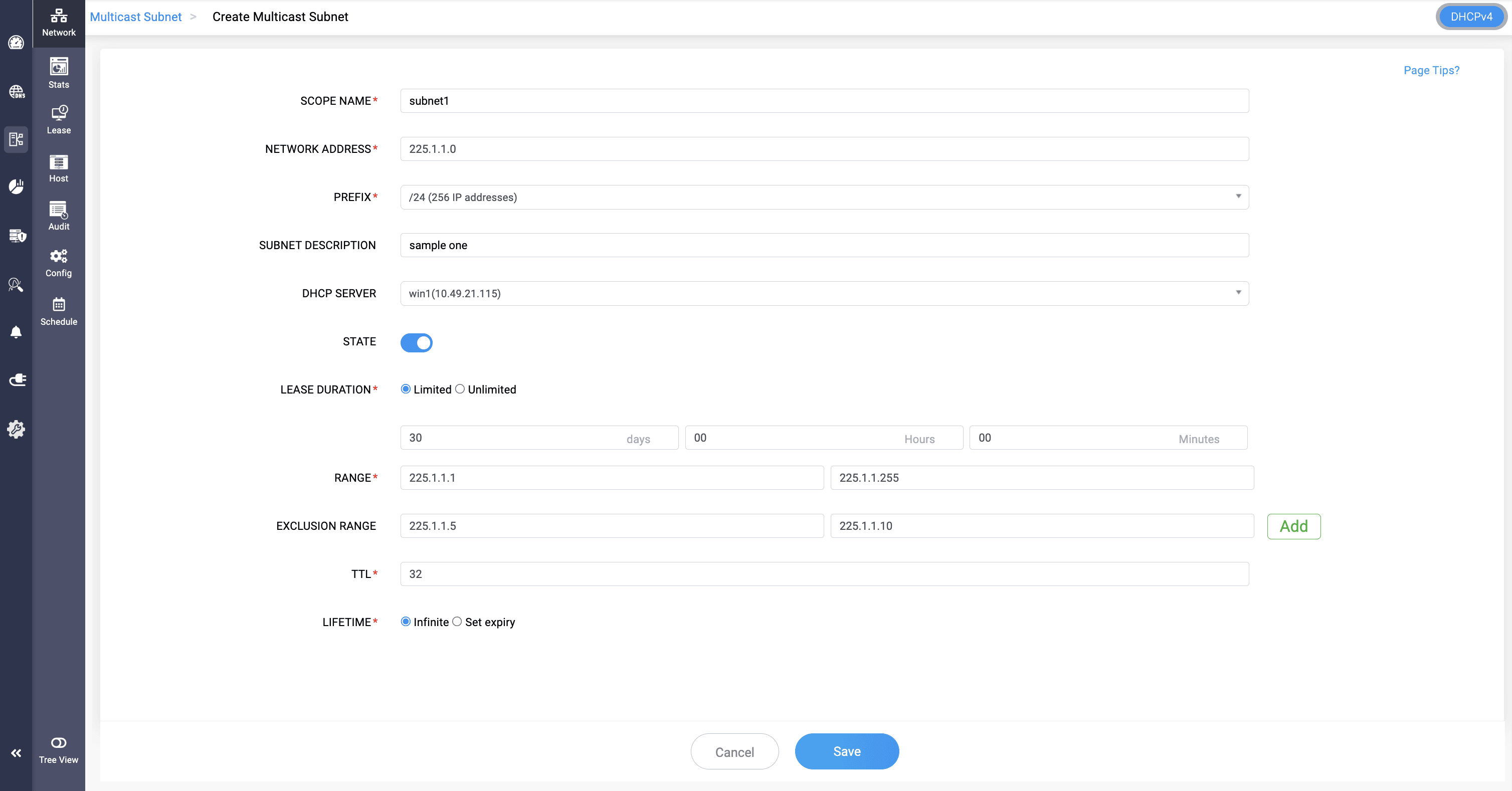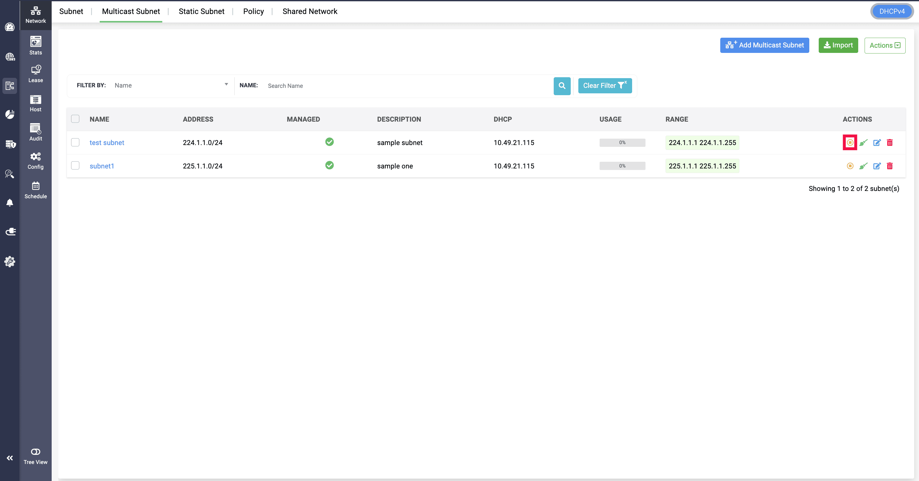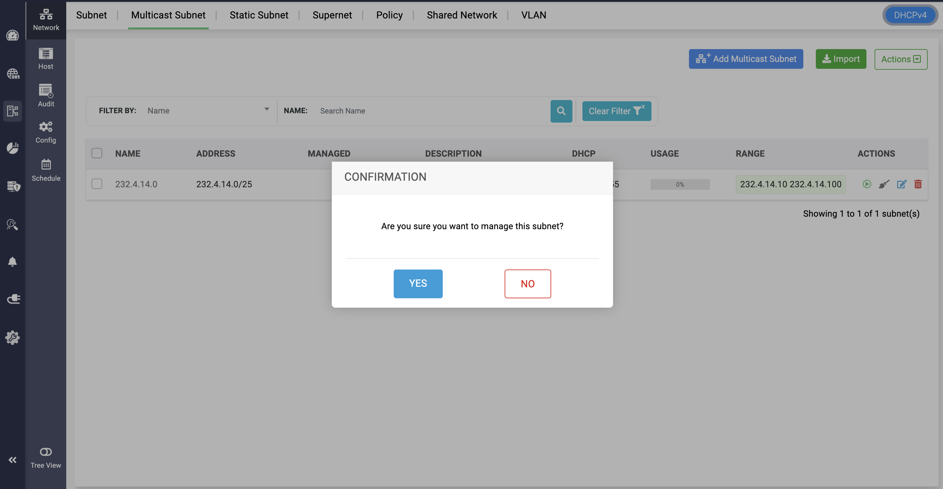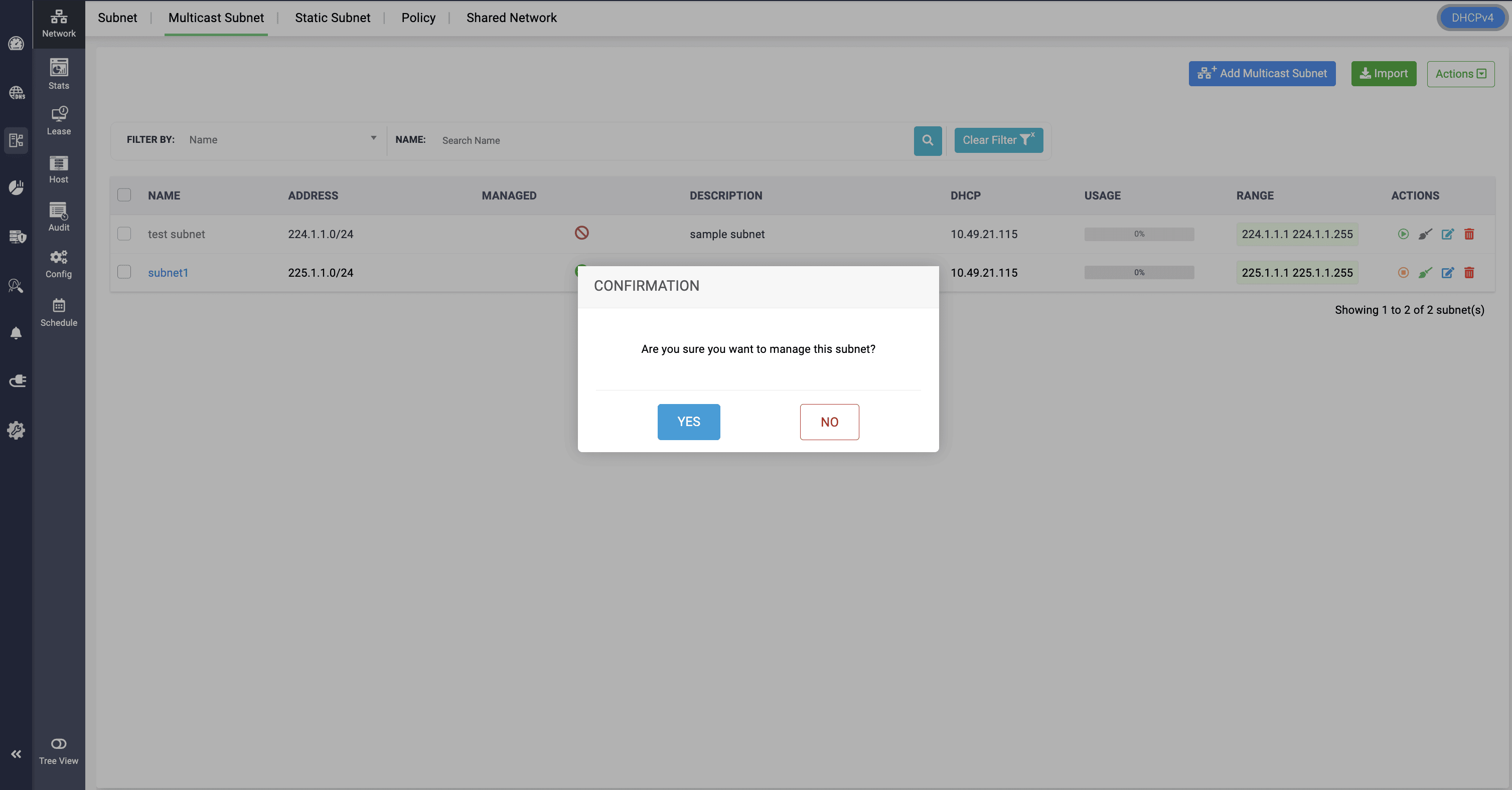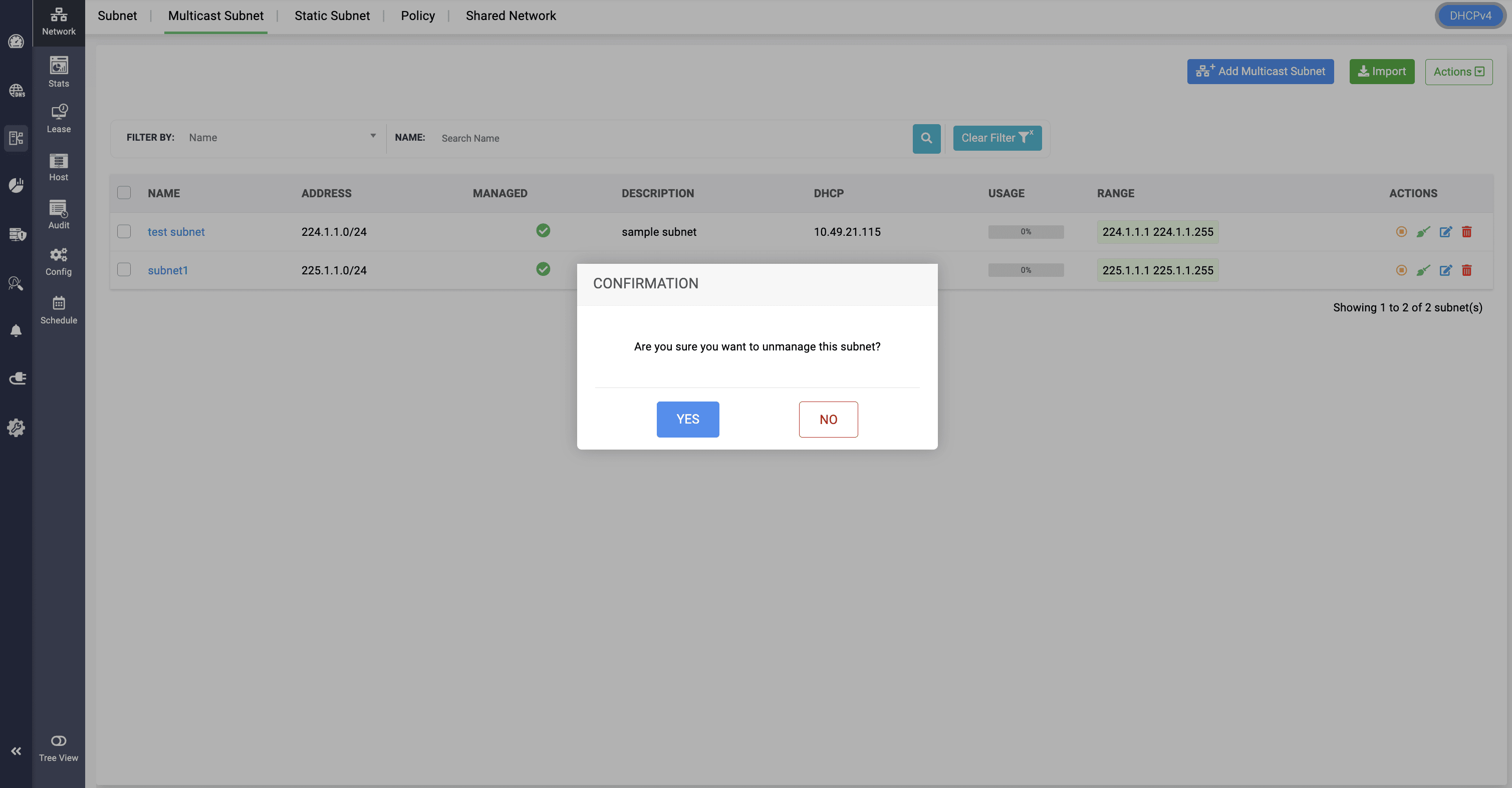 Note: Multicast subnets can be unmanaged and managed from serving in the DHCP server by clicking on the Yellow icon and confirming to Unmanage the subnet.