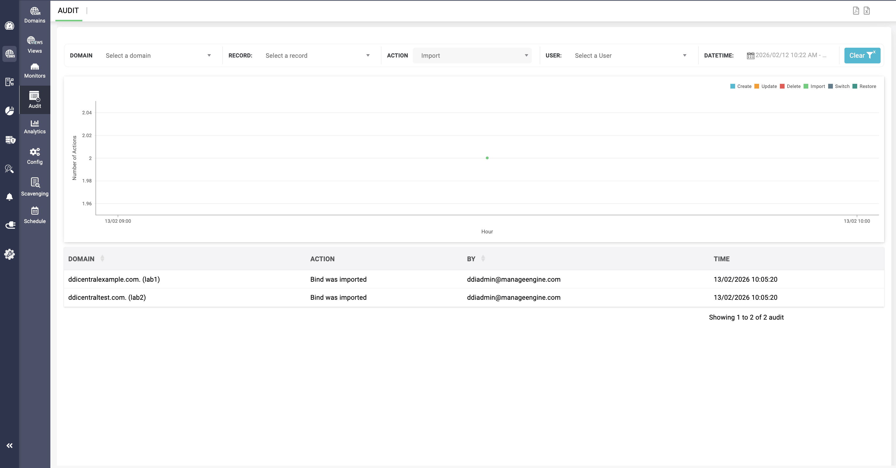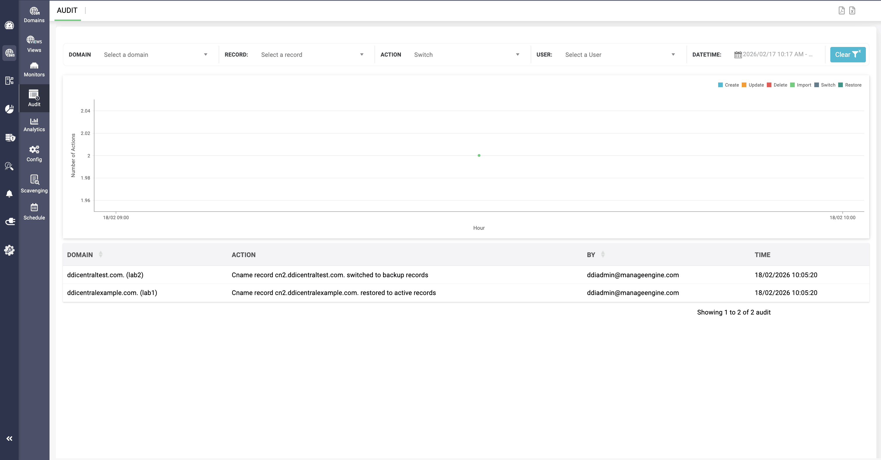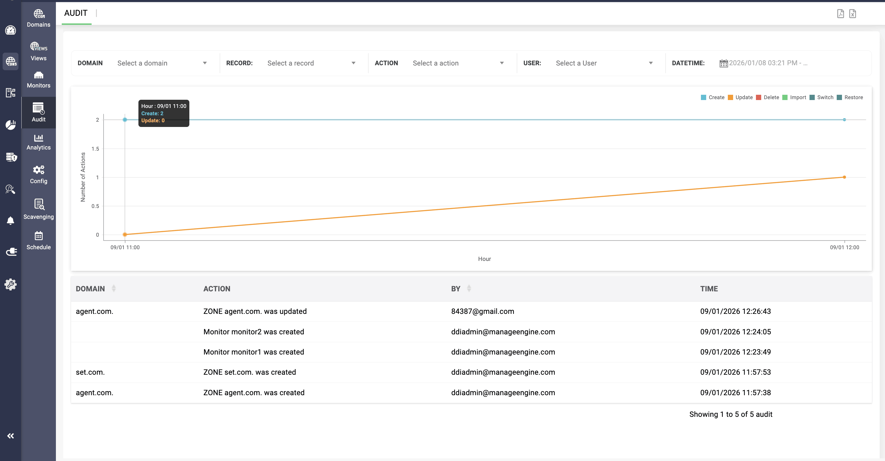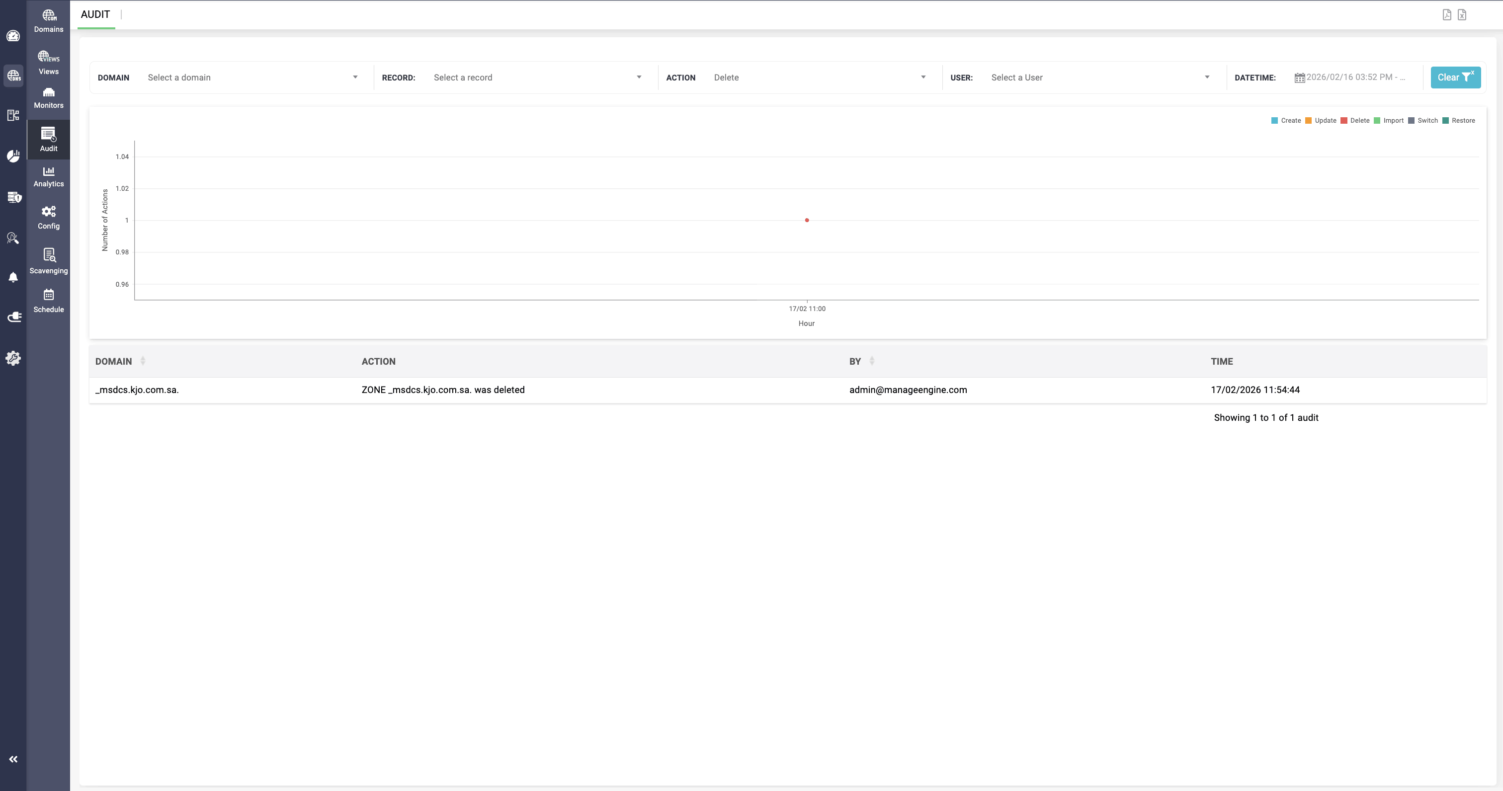 The DNS audit log provides six different action-based filtering options, allowing network administrators to filter and view specific DNS activity logs across the network. This enables more focused visibility and streamlined monitoring. The following actions can be selected for review: