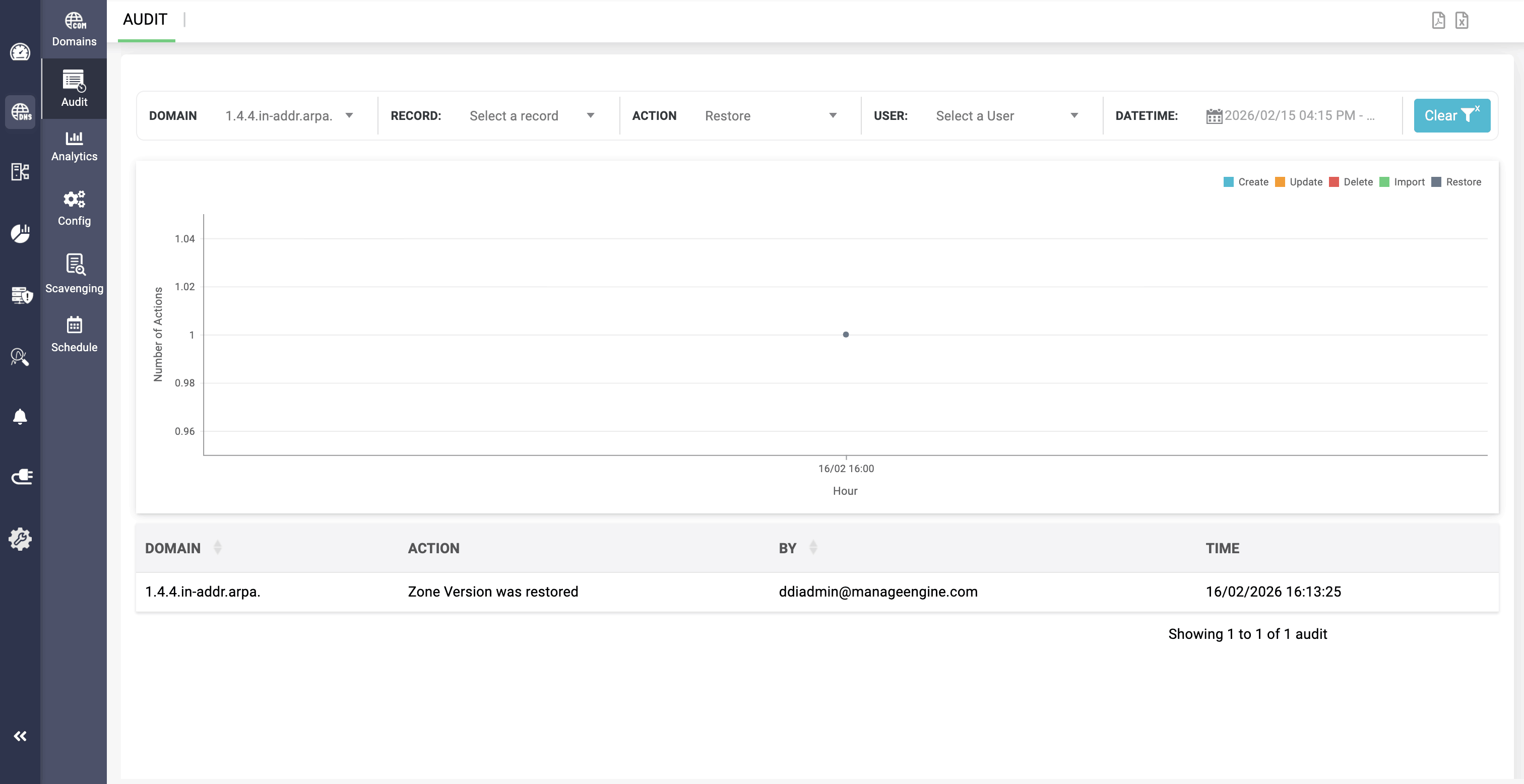 The DNS zones that are restored to their previous versions are logged under this action section.