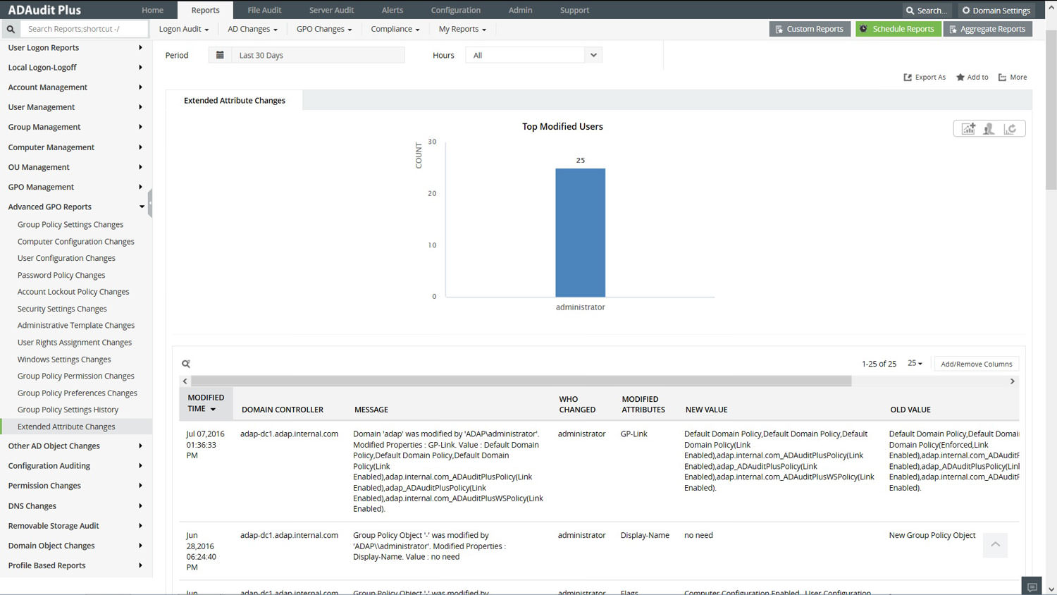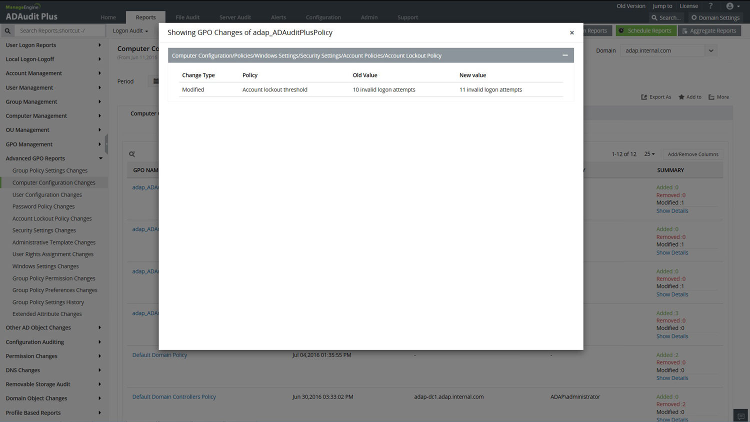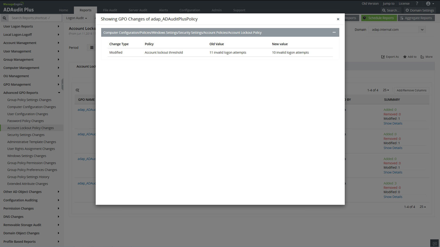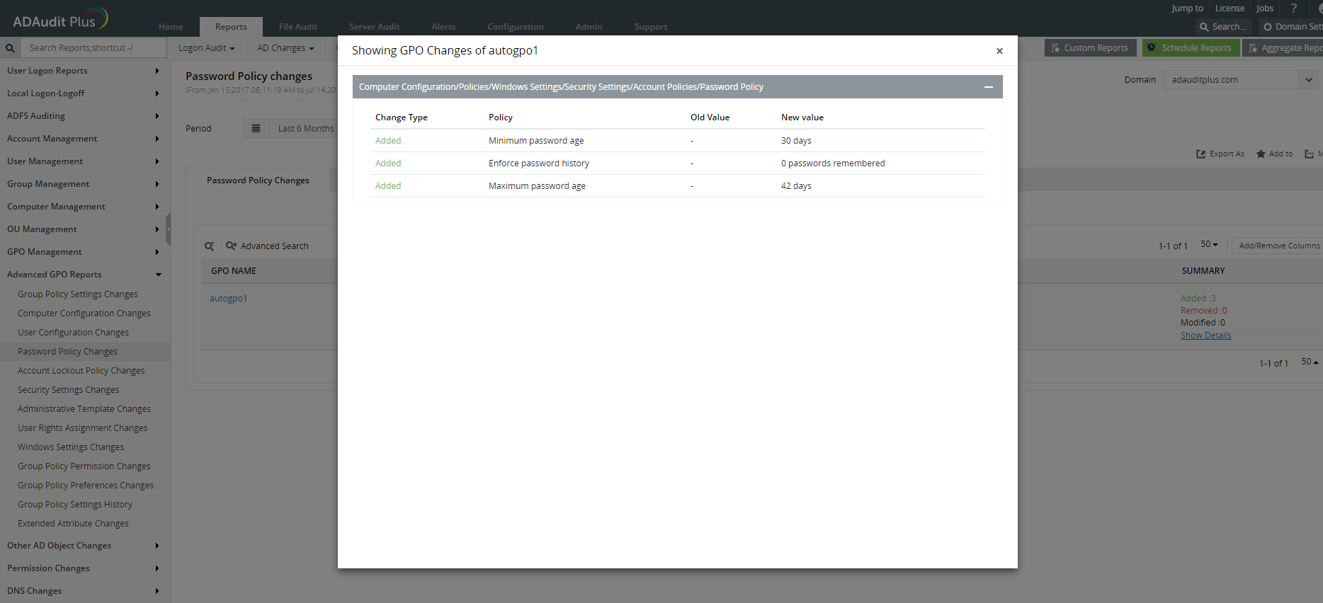 En la práctica regulatoria de cumplimiento de hoy en día se está volviendo obligatorio auditar la configuración de seguridad IT. El enfoque está ahora en los servidores workhorses de Microsoft Windows en el ambiente de active directory. La necesidad es de auditar e informar en tiempo real acerca de los objetos de política grupal (GPO) críticos a la misión, lo cual mayoritariamente define el funcionamiento del sistema para un grupo definido de usuarios. Los GPOs habilitan a los administradores/ usuarios IT a manejar recursos y configuraciones de forma centralizada a lo largo de la red. Un único error de configuración puede ser catastrófico y puede tener un efecto dominó en el acceso/ uso no autorizado y comprometedor para la seguridad IT. ADAudit Plus le ayuda a evitar las complejidades del monitoreo de GPOs con informes pre configurados en tiempo real y auditoría de los cambios junto con alertas dentro del dominio & OU.