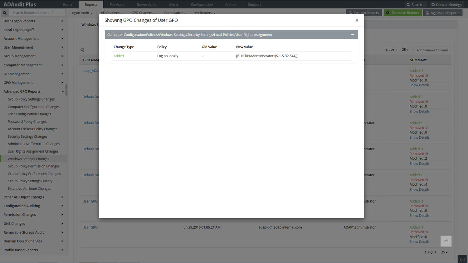 El informe sabelotodo se enfoca en dar una vista desde arriba con un resumen detallado de los nuevos y antiguos valores de todos los cambios GPO.