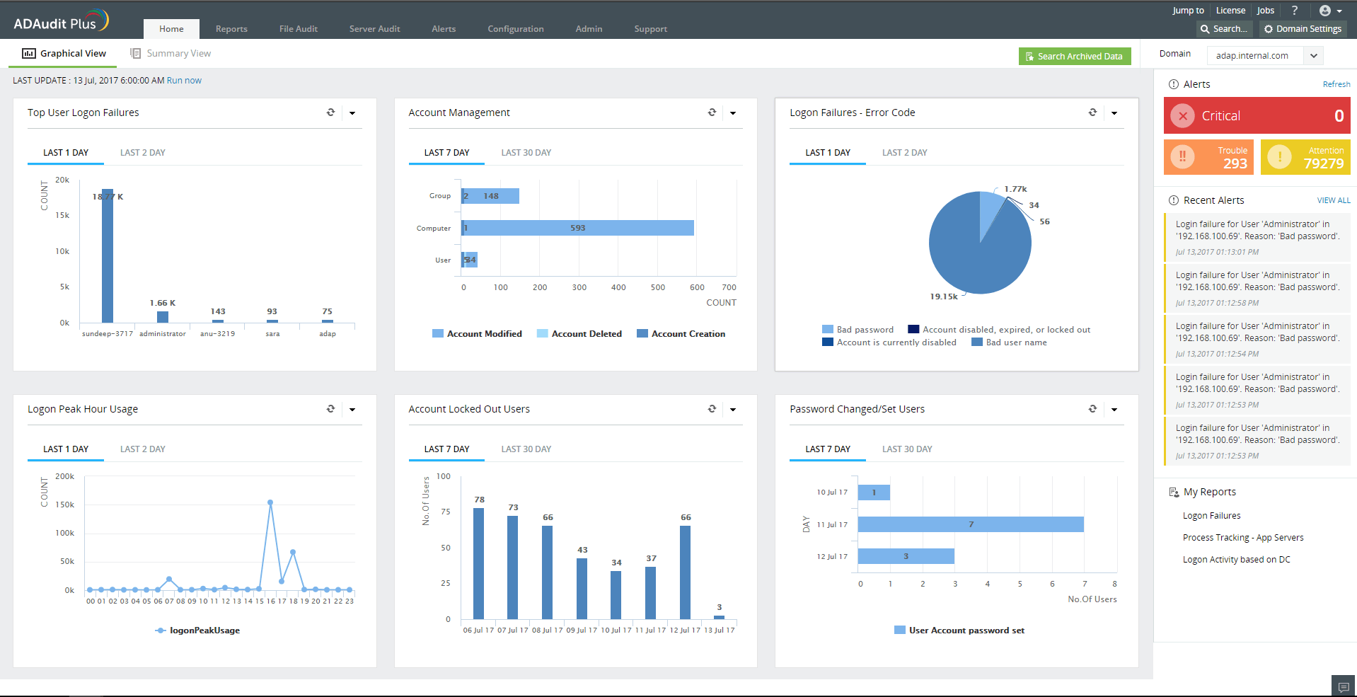ADAudit Plus también provee una visualización gráfica que resalta el resumen de cada informe. Hay visualizaciones del dashboard a mayor profundidad en tiempo real sobre los cambios de eventos más importantes, lo cual permite un entendimiento más fácil. La vista dashboard usa herramientas como líneas de tendencias, gráficas de torta y gráficas de barras para revisar la información resumida de los informes.