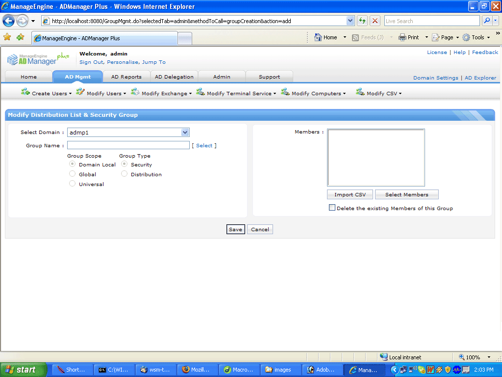 ADManager Plus le permite modificar grupos de Active Directory simplemente seleccionando al grupo e importando los miembros o seleccionándolos de la lista. Esto elimina la necesidad de seleccionar usuarios individuales de Active Directory y de modificar su asociación con los grupos respectivos en Active Directory. El alcance de los grupos no puede ser modificado por motivos de seguridad.